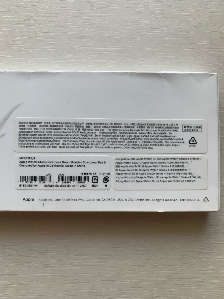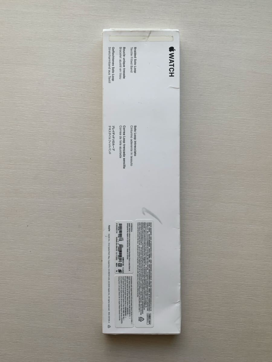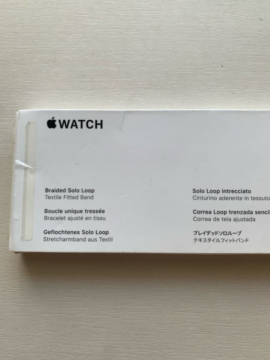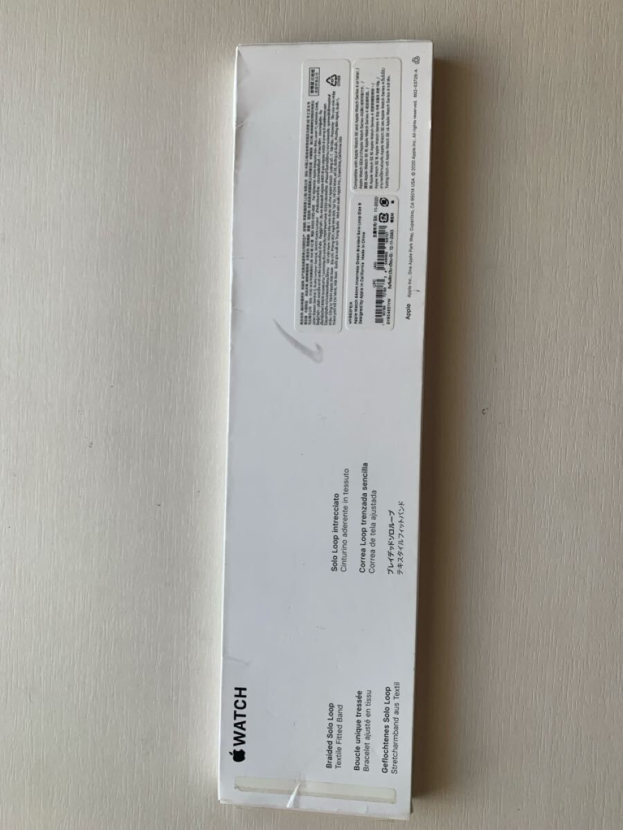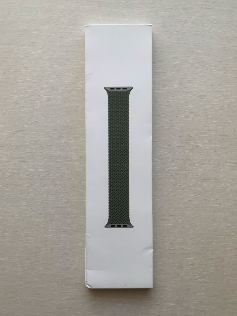 Apple Watch用の純正ブレイデッドソロループ、44mmモデルです。カラーはグリーンブレイデッド、サイズは9。開封済みの使用品で、外箱にダメージがあります。