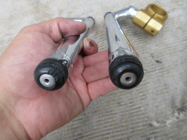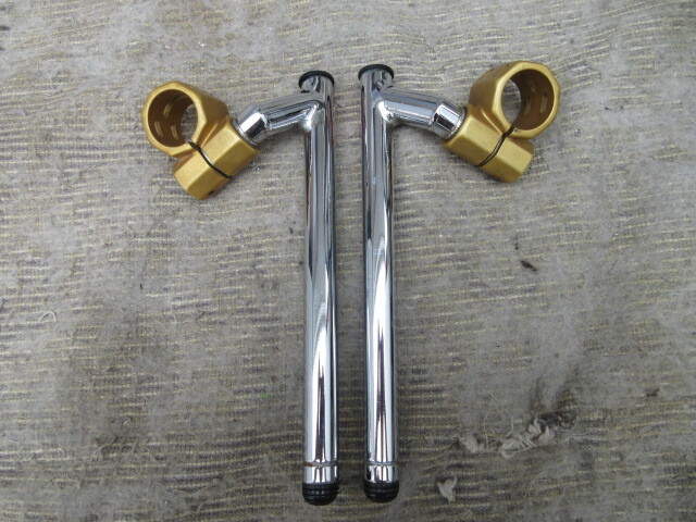 当時物 トマゼリ セパハン 八角ゴールドコマンダー(フォーク取付け径35パイ)です、状態ですが4、5枚目写真のように左右とも脇の部分に多少錆びがあり、7、9枚目写真のように右側のステッカー多少剥がれがあり、左側のバーエンドにガリキズがあります、その他小キズ小塗装ハゲ程度でバーの穴空け加工もなくわりと状態は良いです、発送はヤマト着払いになります。