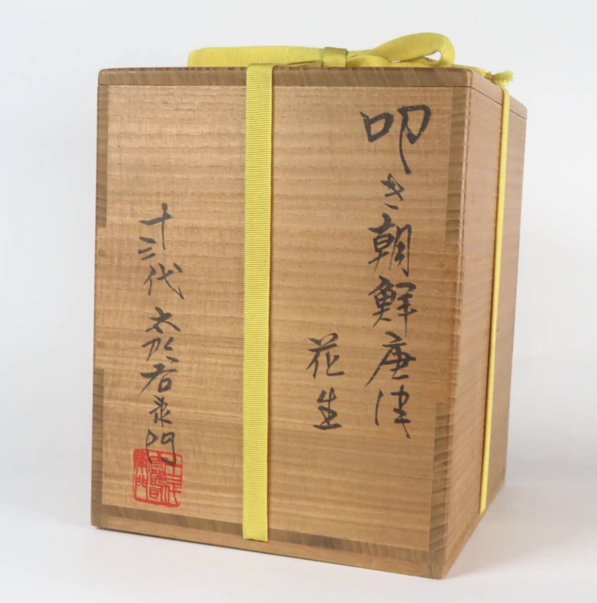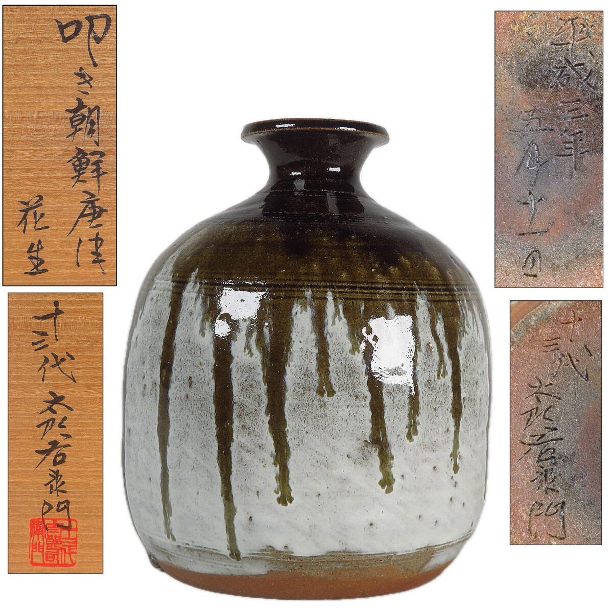 【SAKURAYA】希少な本人作品【叩き朝鮮唐津 花生/唐津焼の名工 十三代 中里太郎右衛門】花瓶 壷 茶道具 作家 共箱/栞 骨董品 高さ20cm