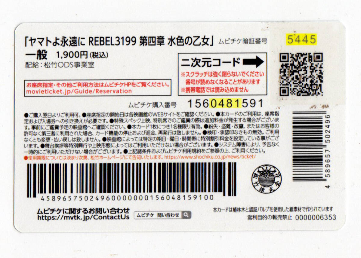 ヤマトよ永遠に REBEL3199 第四章 水色の乙女 ムビチケカード 第一弾 宇宙戦艦ヤマト【使用済】