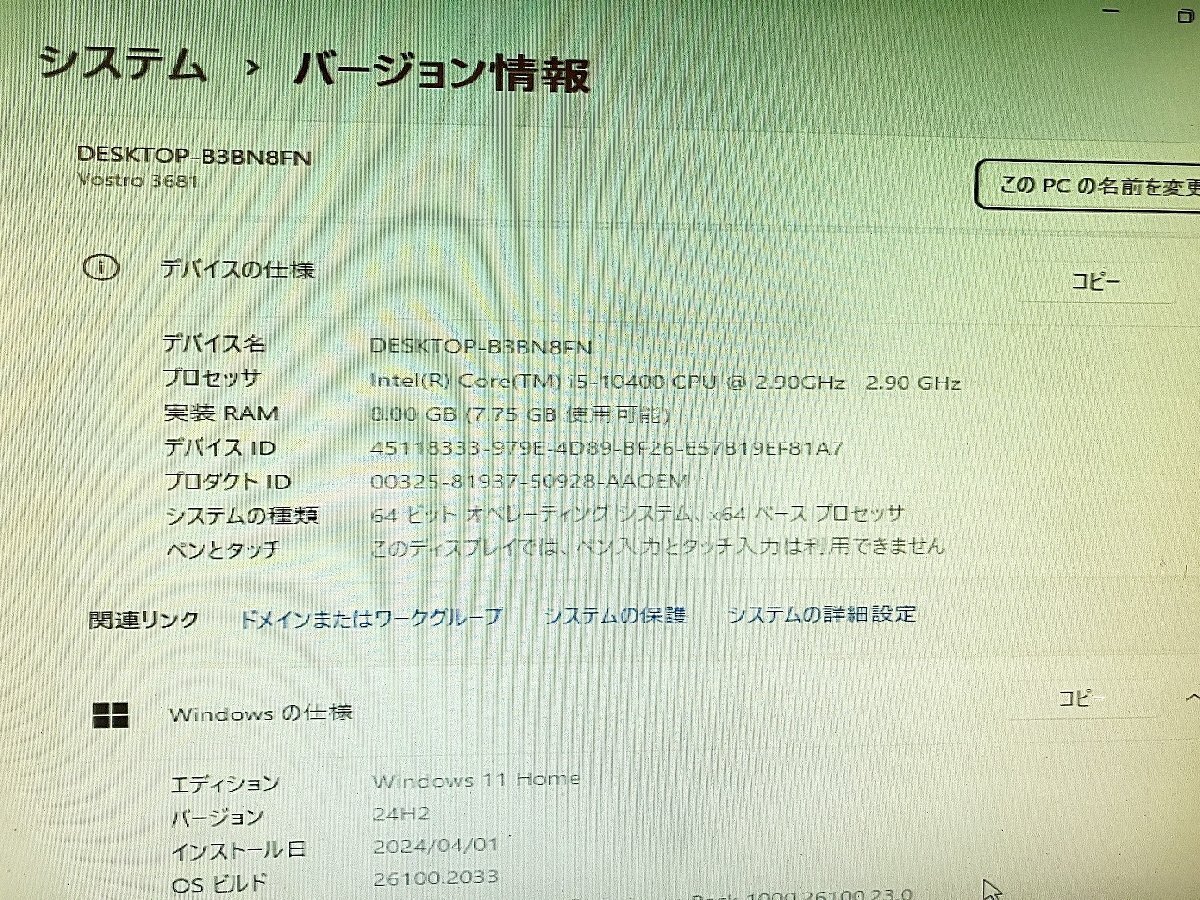 Product name: 【1円スタート】【埼玉発送】【動作確認済】Dell / Vostro 3681 / i5-10400 CPU @ 2.90GHz / 8GB / HDD1TB / Windows11Home