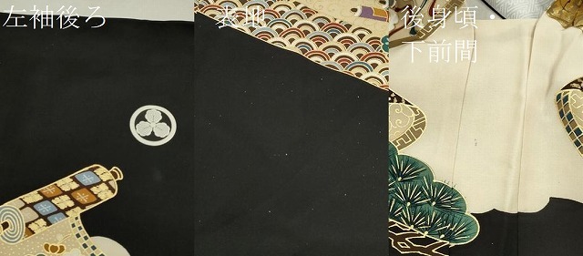 羽織【表地:正絹・胴裏:化繊・五つ紋】の状態は接写画像のように左袖後ろ・後身頃と下前間に薄い汚れ、表地の金彩に剥がれがございます。