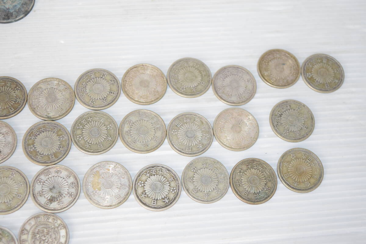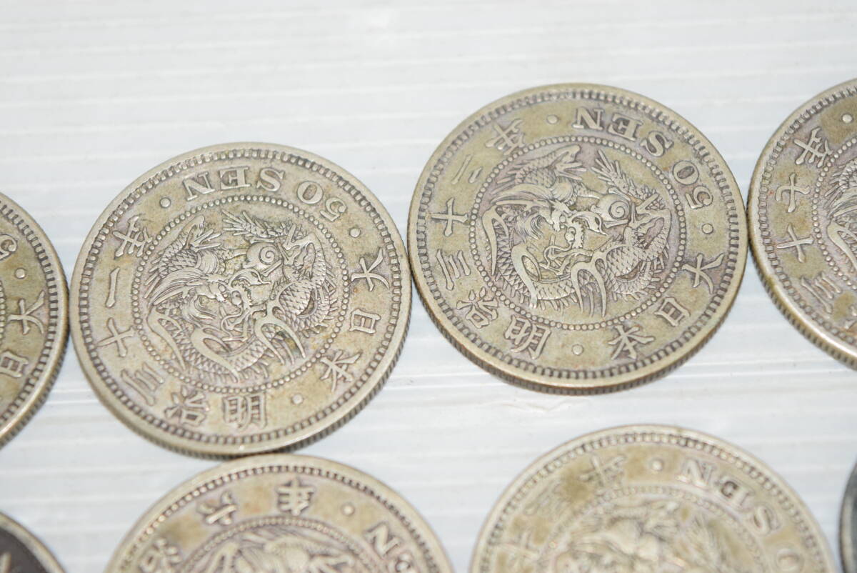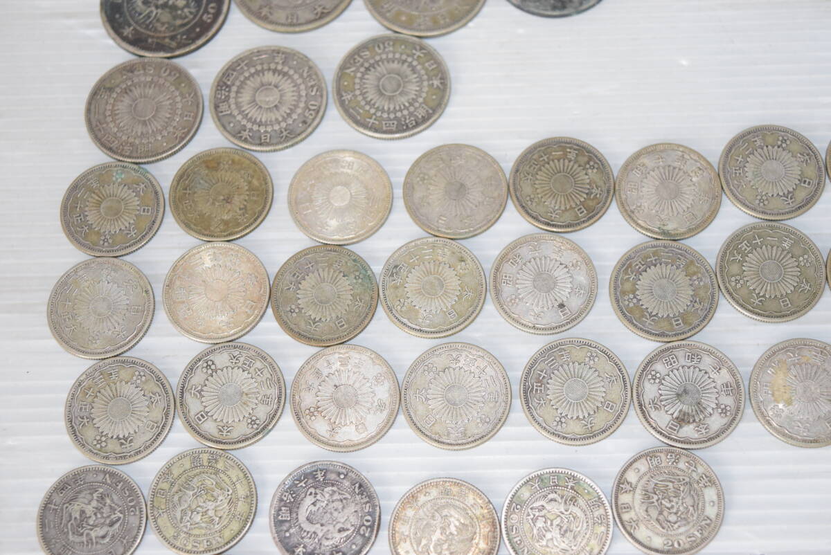 M 旭日竜50銭銀貨 9枚 鳳凰50銭銀貨 34枚 旭日50銭銀貨 3枚 20銭 9枚 10銭 3枚 合計 58枚 総重量 378g 古銭
