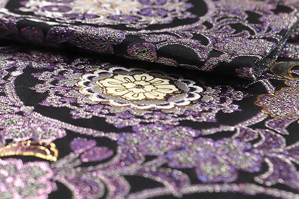 全体には白色や光沢のある紫色の糸、パール箔で華文や桜が織り上げられております。