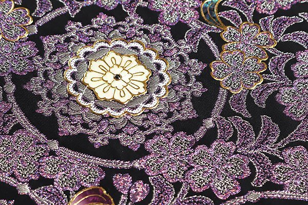 お太鼓には、ブラックダイヤモンドや螺鈿、盛り金が施されており、高級感があります。