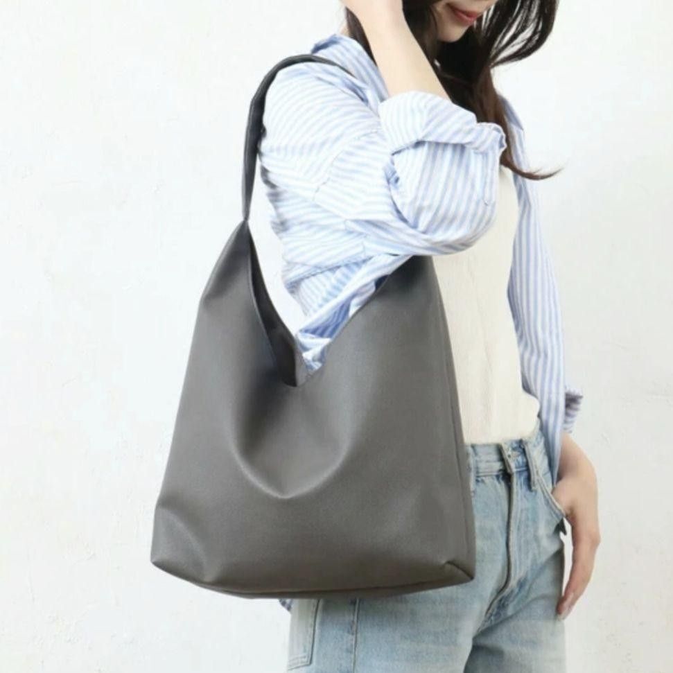 本革風フェイクレザーとくすみカラーが大人かわいい。大容量ソフトラウンド肩かるトート。
