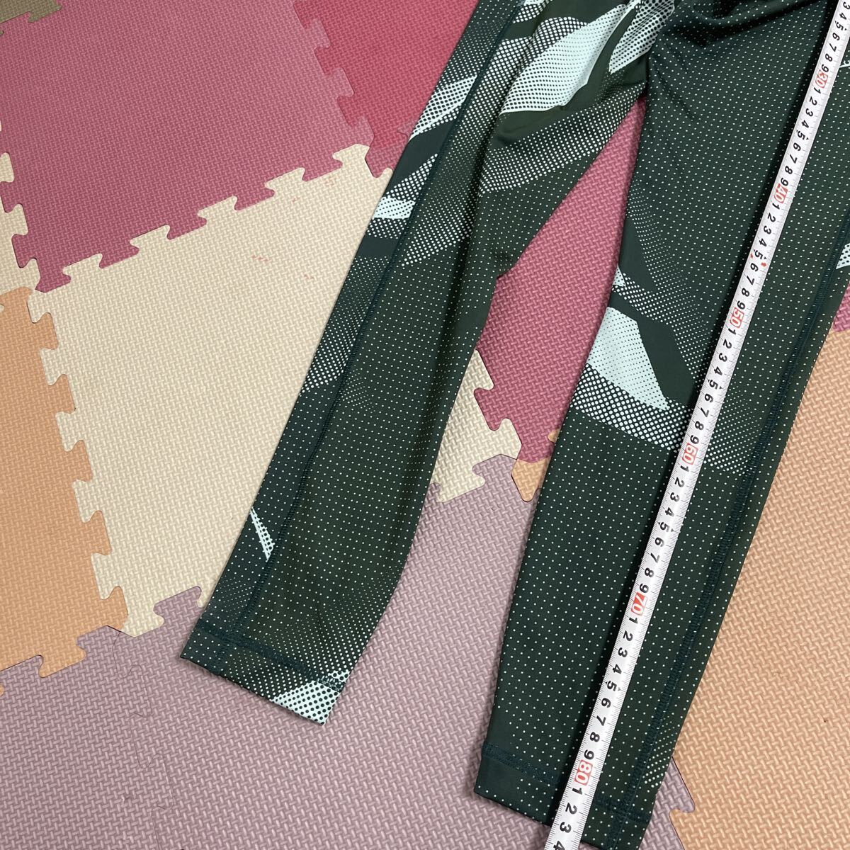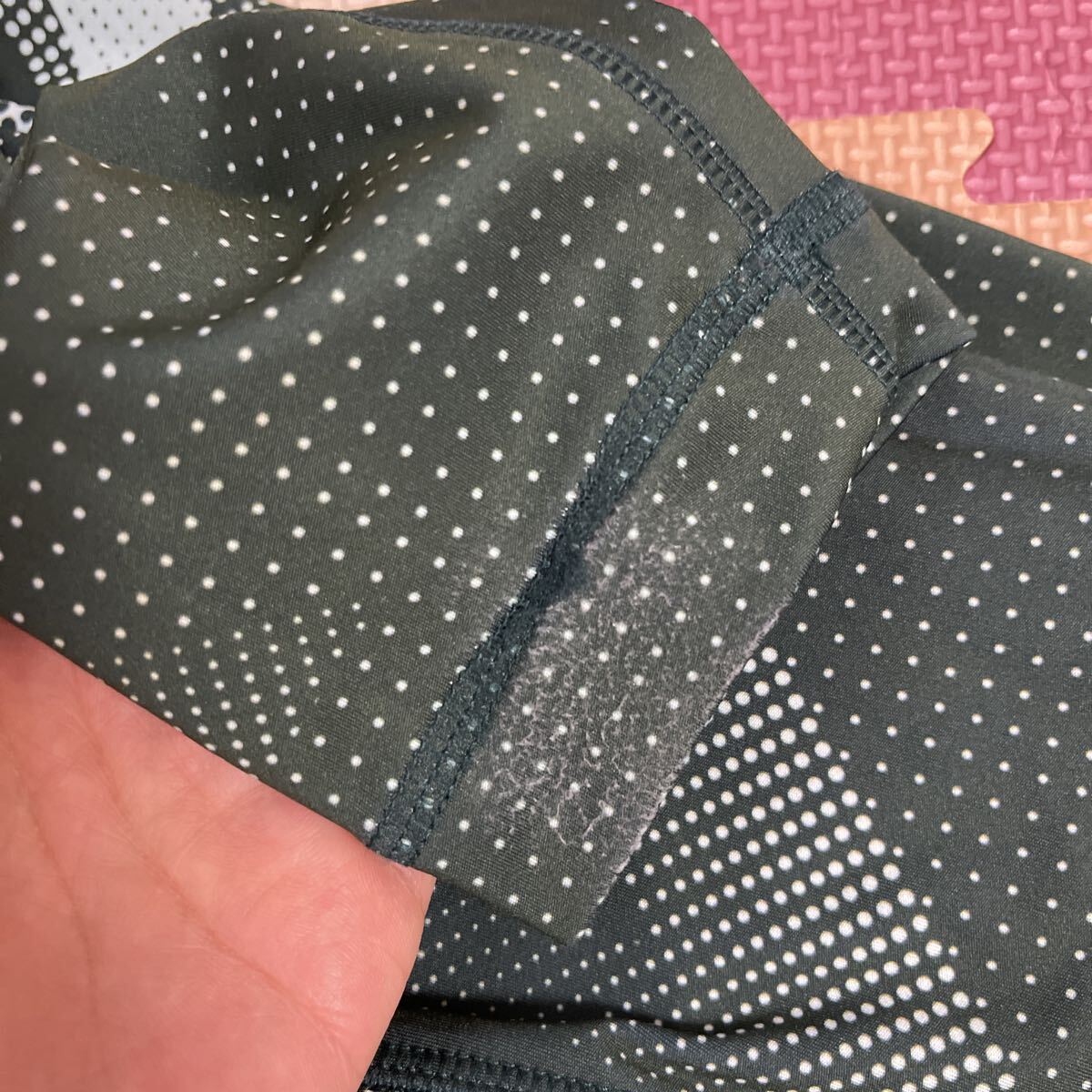 足首の方の裾の縫製がやや甘いのか、シューズが当たったからか痛みがあるため、そこを写真で撮っています。