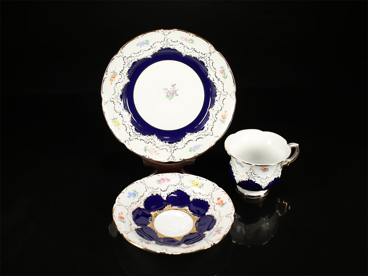 【吉】CH452 MEISSEN 【マイセン】 瑠璃釉金彩色絵花紋 カップ&ソーサー プレート 1組 3点セット/美品