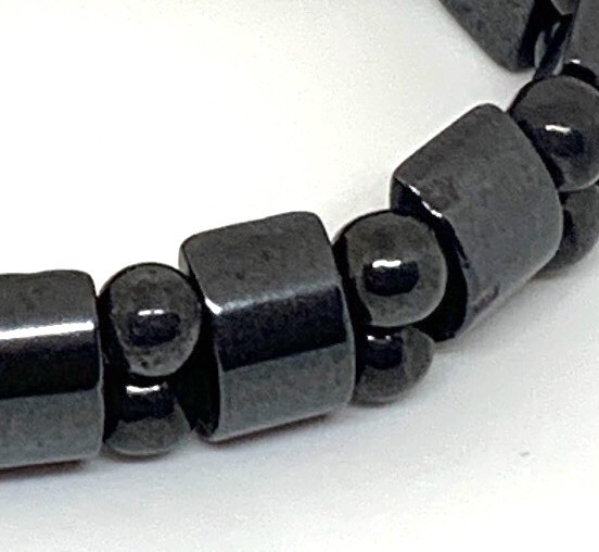 スタイリッシュなヘマタイト磁気ブレスレットのご案内です。磁気ヘマタイトは身に着ける人の血液にエネルギーを与えるとされています。赤血球の働きを活性化し、全身への酸素供給量が高める事から、運動能力を高める効果や肉体労働をされている方には特におすすめで持久力を高めると言われています。(薬事効果を保証するものではありません)コーティングはありますが、ヘマタイトは鉄分を含むため、汗は早めに落とし汚れは乾いた柔らかい布で軽く落としてください。手首サイズ18センチまでの方に。