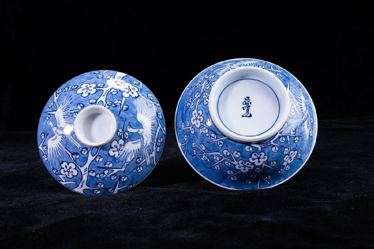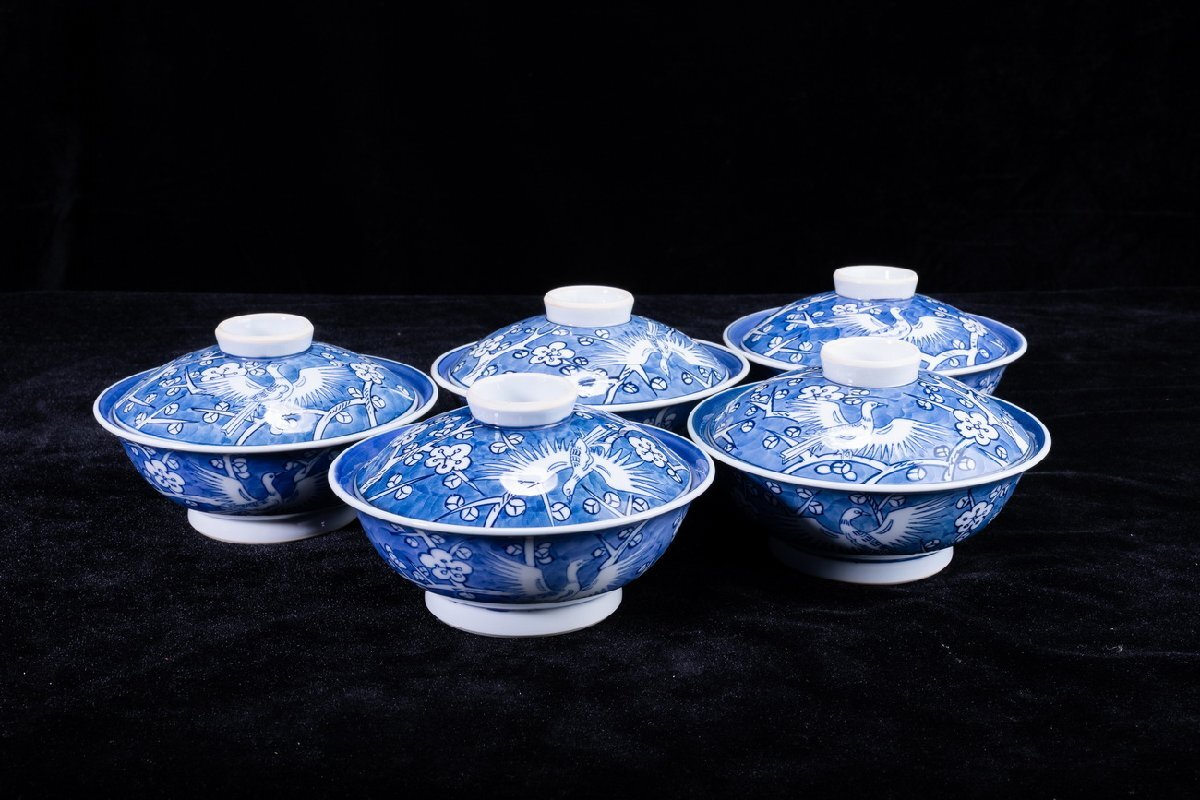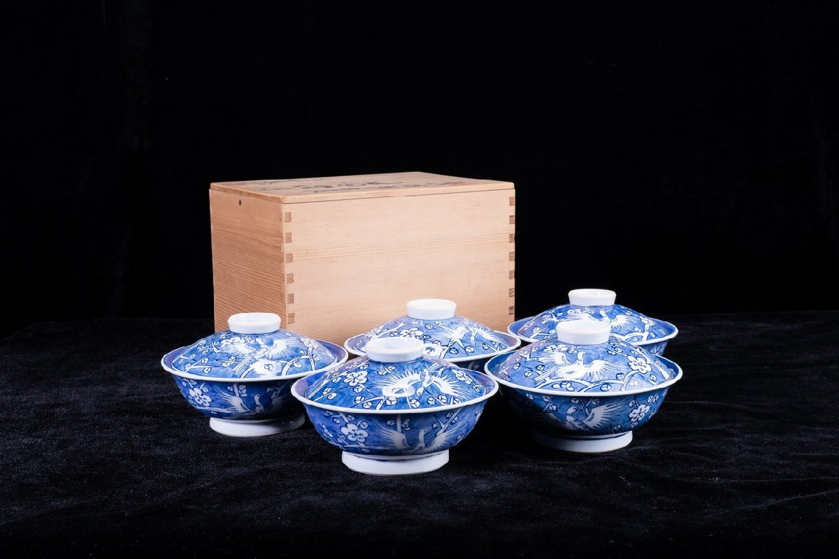 Product name: 【珍品堂】1円から M75-V04 有田焼 館林源右衛門窯 染付 梅鳥紋 蓋向付 5客 蓋茶碗 共箱 木箱 蓋物 名窯 和食器 懐石 骨董品 古美術 時代物