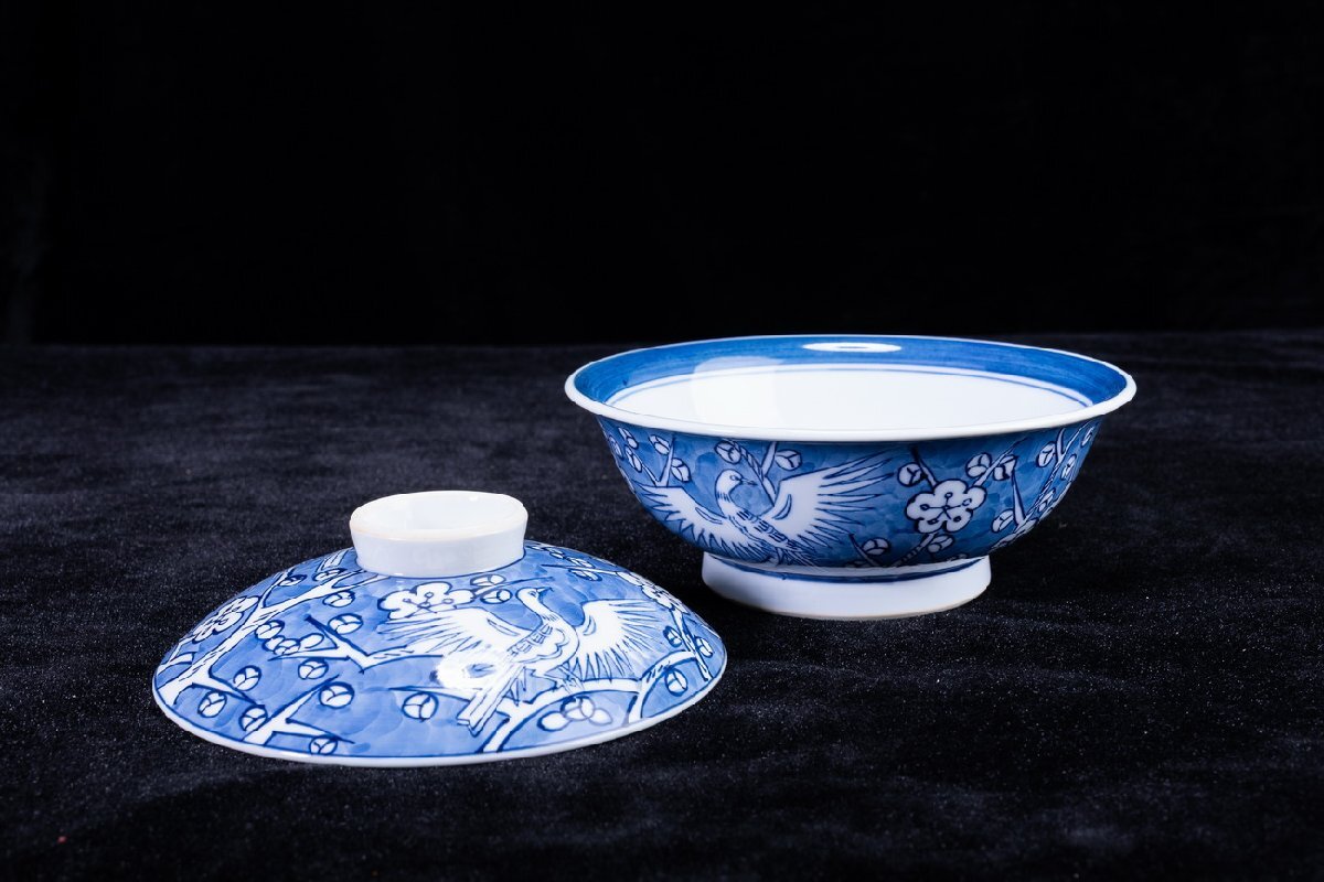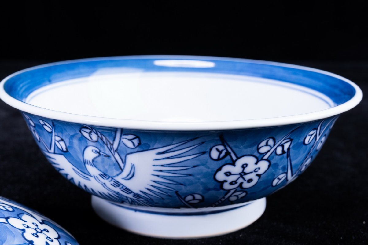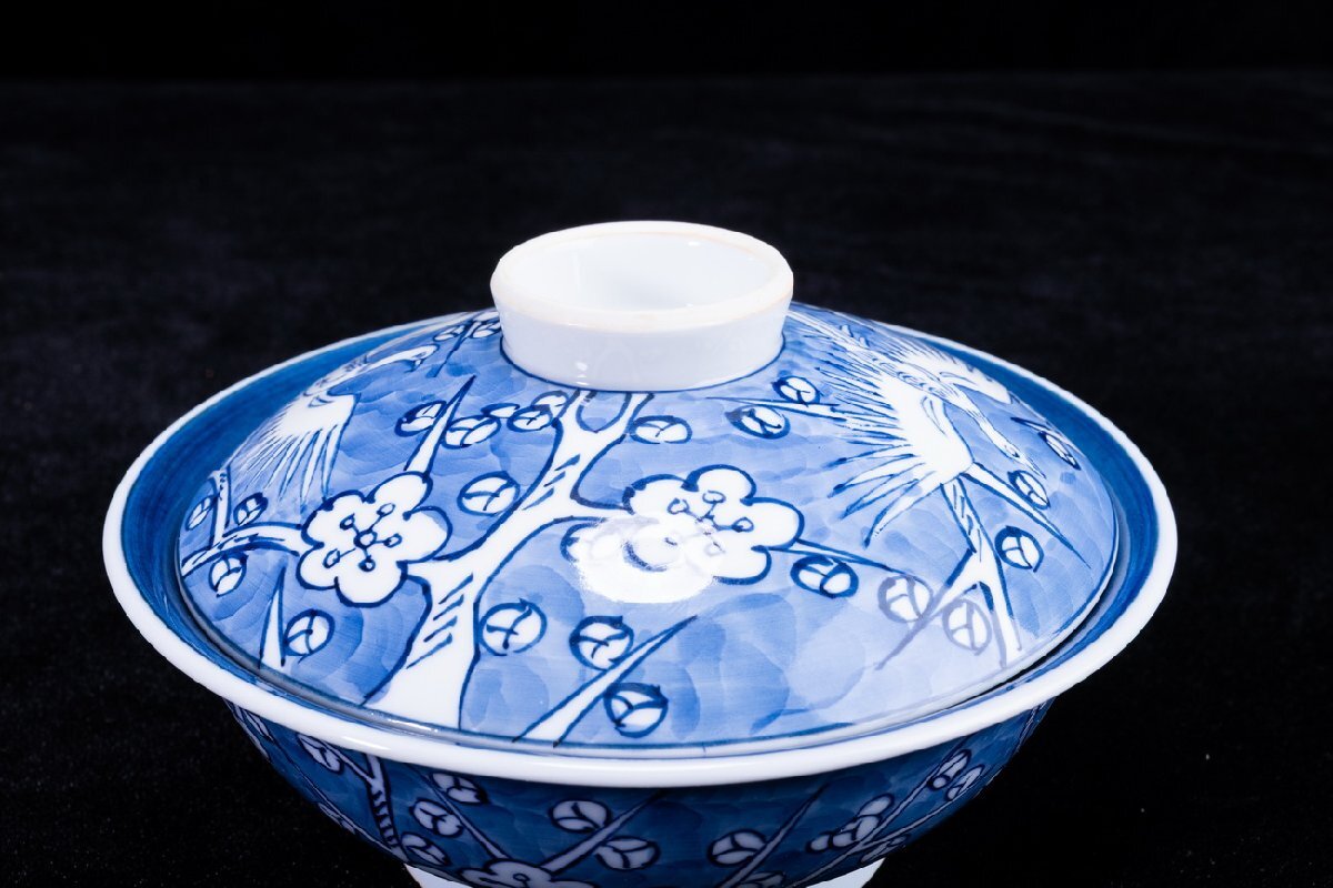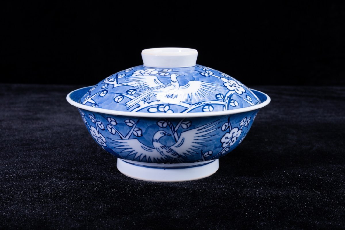 Product name: 【珍品堂】1円から M75-V04 有田焼 館林源右衛門窯 染付 梅鳥紋 蓋向付 5客 蓋茶碗 共箱 木箱 蓋物 名窯 和食器 懐石 骨董品 古美術 時代物