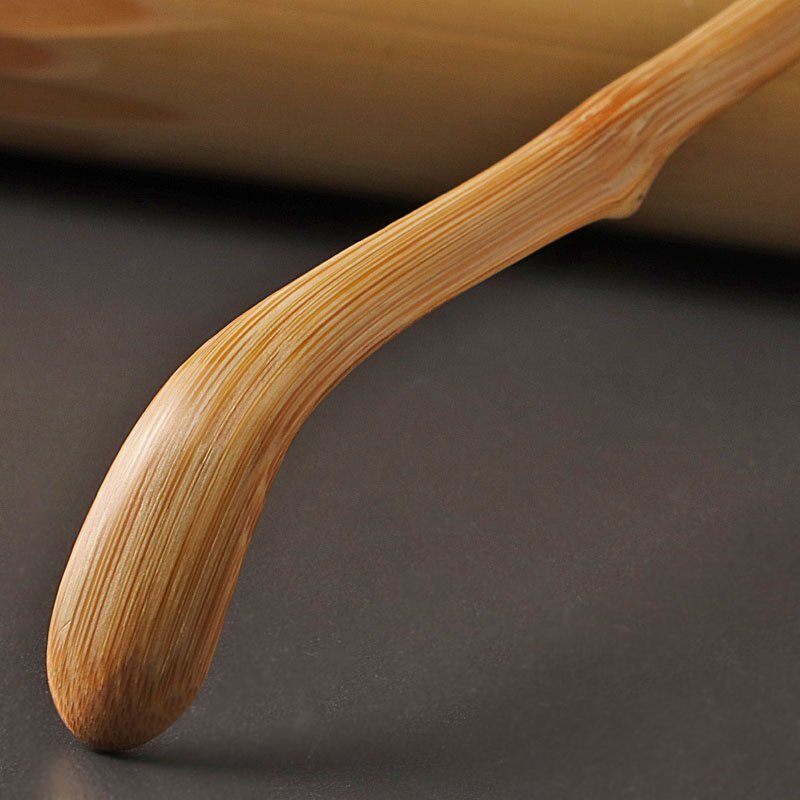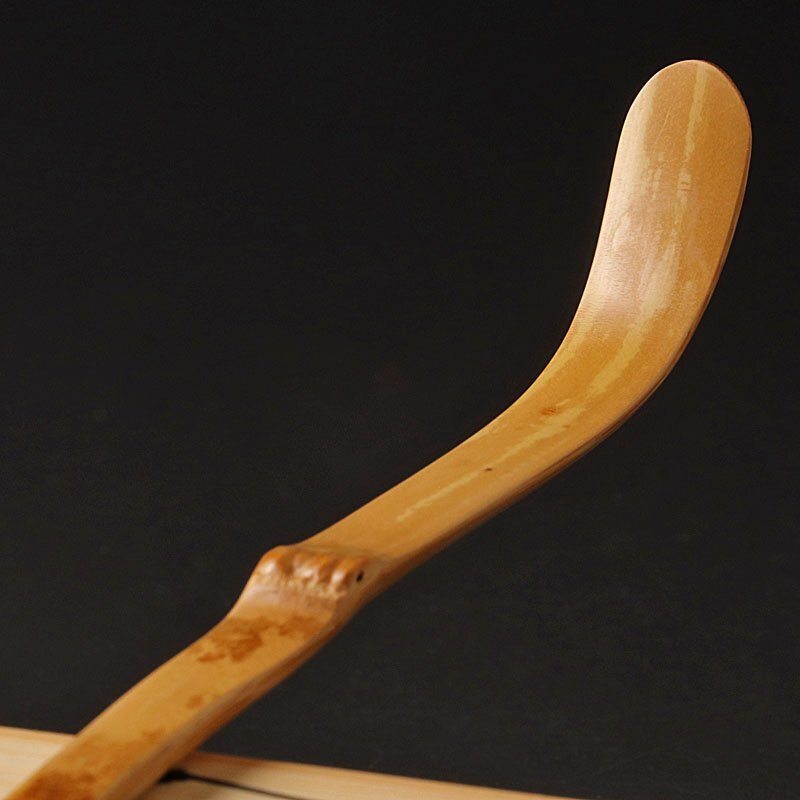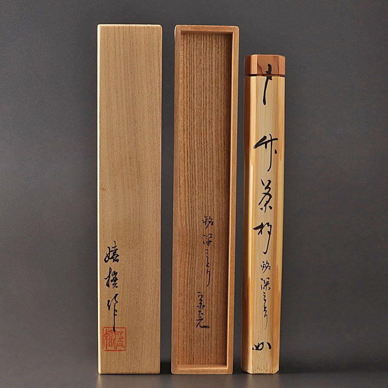 銘「深みどり」は、初夏の木立に差す光のような、深く澄んだ心を映します。竹の節と曲がりに宿る自然の美を見極め、削りの一刀に茶人の精神を宿すその技は、まさに現代の茶筌師の粋。竹の柔らかな艶と、銘に込められた季節の情緒が響き合い、手に取るたびに茶席の空気が静かに深まります。