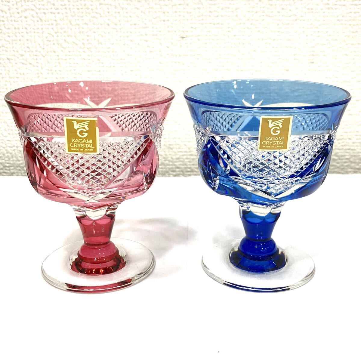 TA★1円~ 未使用 保管品 KAGAMI CRYSTAL カガミクリスタル 江戸切子 色被せ ペアグラス レッド ブルー 懐石杯
