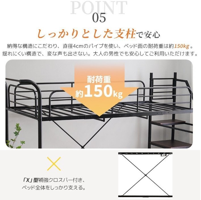 Product name: システムベット ロフトベッド シングル デスク付き コンセント付き 収納付き ハンガーポール付き 耐荷重150kg 北欧風 スチール 耐震