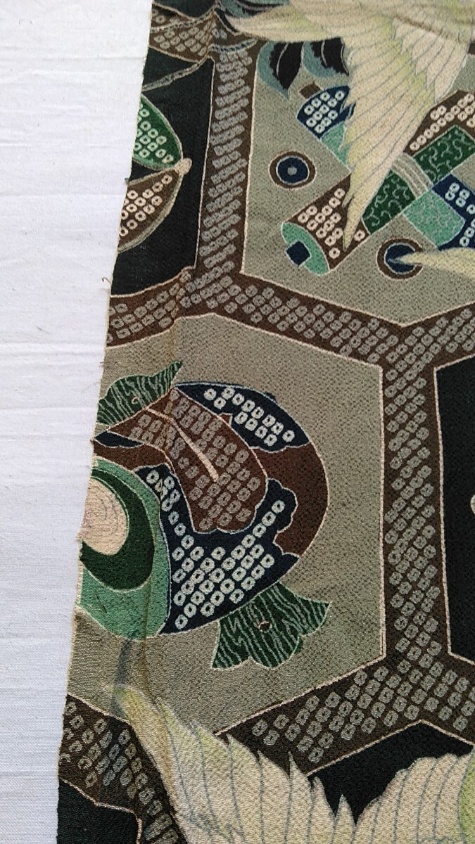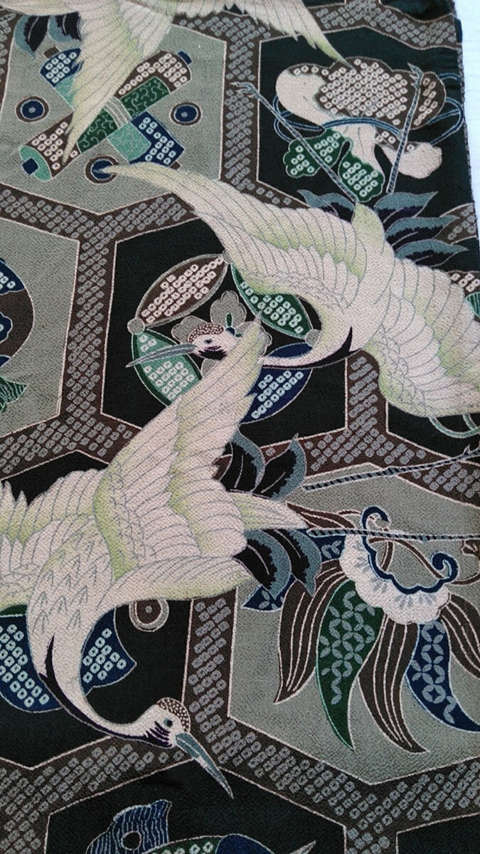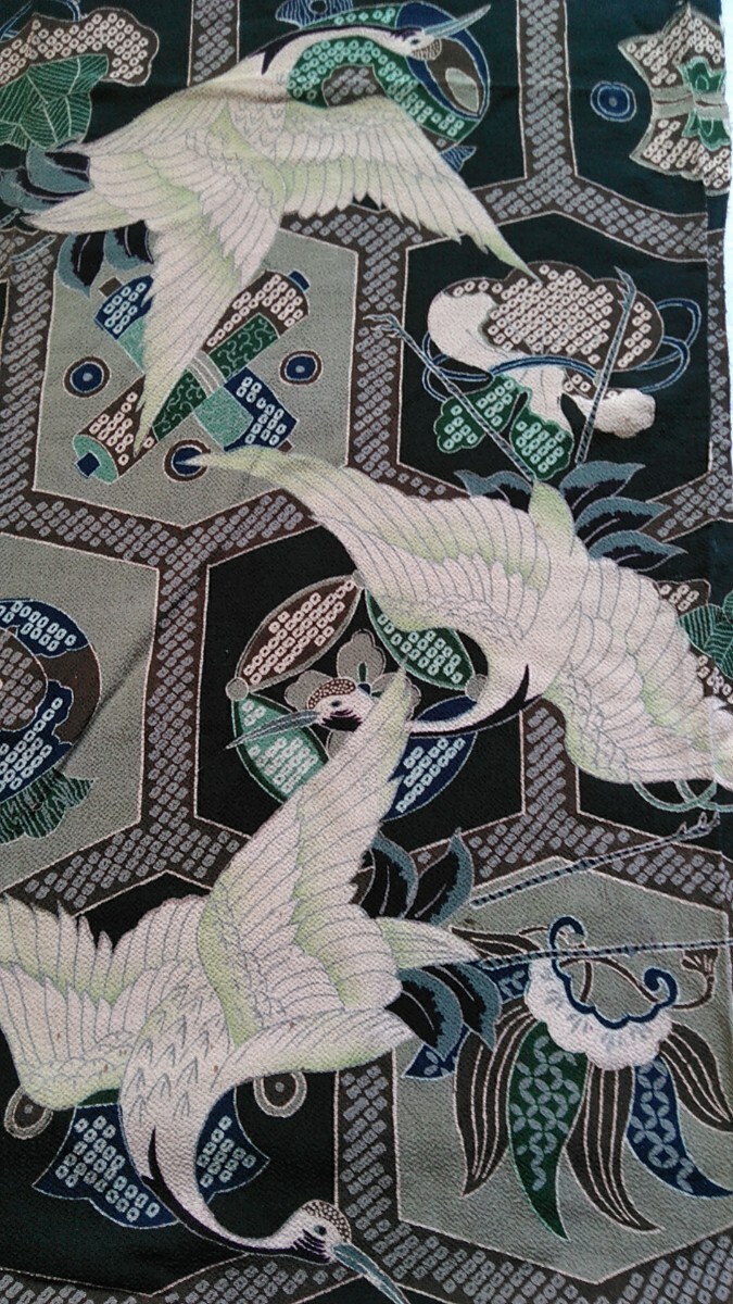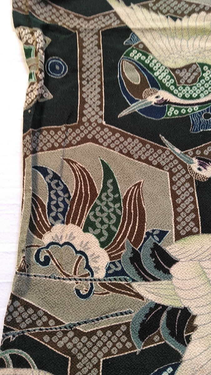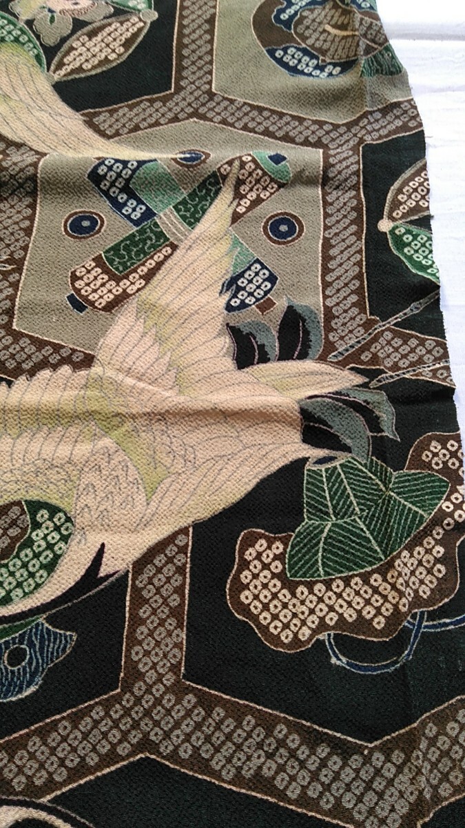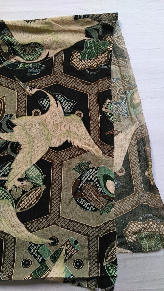 古布 古裂 レトロ 縮緬生地 鶴柄 濃い深緑色 薄い深緑色 2枚 リメイク