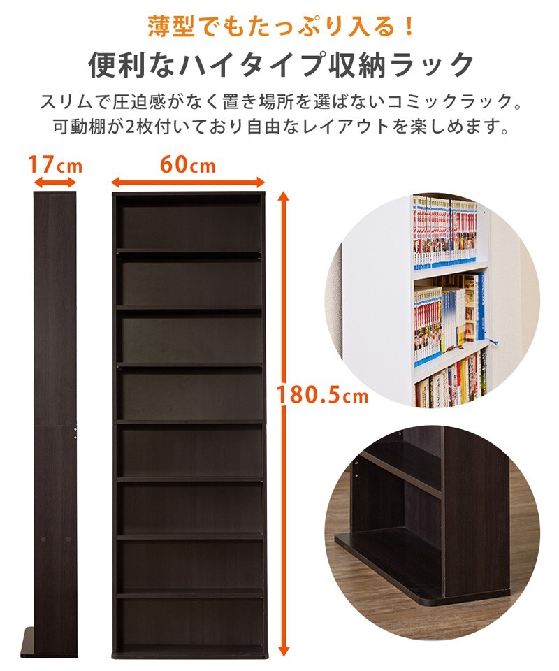 Product name: 本棚 コミックラック 収納 幅60cm 高さ180cm ハイタイプ スリム 薄型 内寸15cm CD DVD HMP-05 ホワイト(WH)