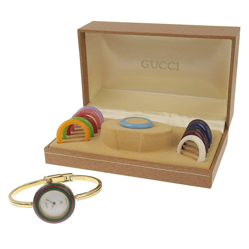 グッチが得意としたバングル型の腕時計・バングルウォッチで、最大12色のベゼルを自由に交換してお楽しみいただける遊び心あふれる仕様のお品物です。