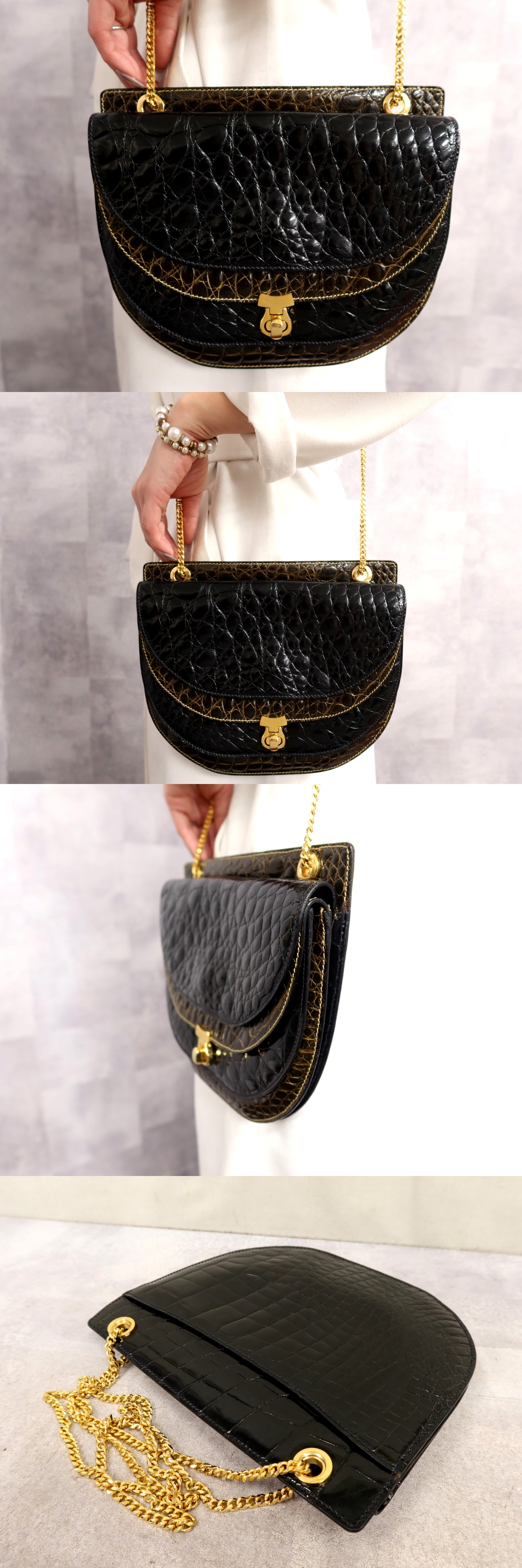 Product name: ●超美品●SANTAMARIA サンタマリア●クロコダイル 本 ワニ 革●ショルダー バッグ●黒 ブラウン系●ゴールド金具●肩掛け●収納●Js64736