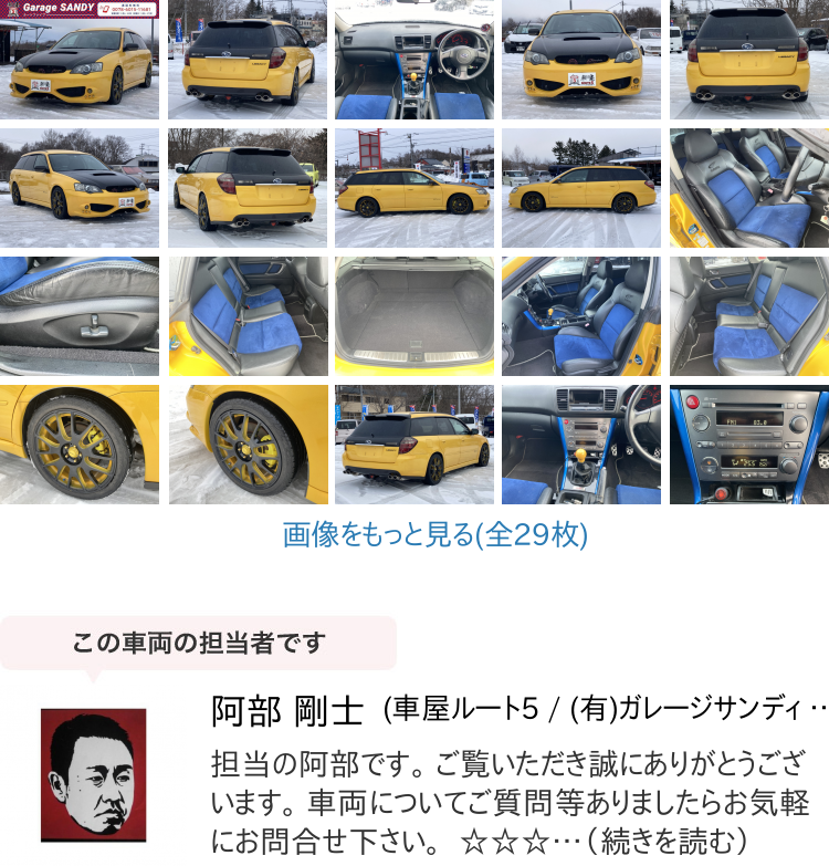 車両状態コメントH.16(2004)年 スバル レガシィツーリングワゴン 2.0 GT スペックB 4WD ターボ/マフラー/カスタム多数!色替! イエロー(色替) 走行187100km・5MT・エアロ・色替え・マフラー・アルミホイール・ターボ・他、カスタム多数!!
