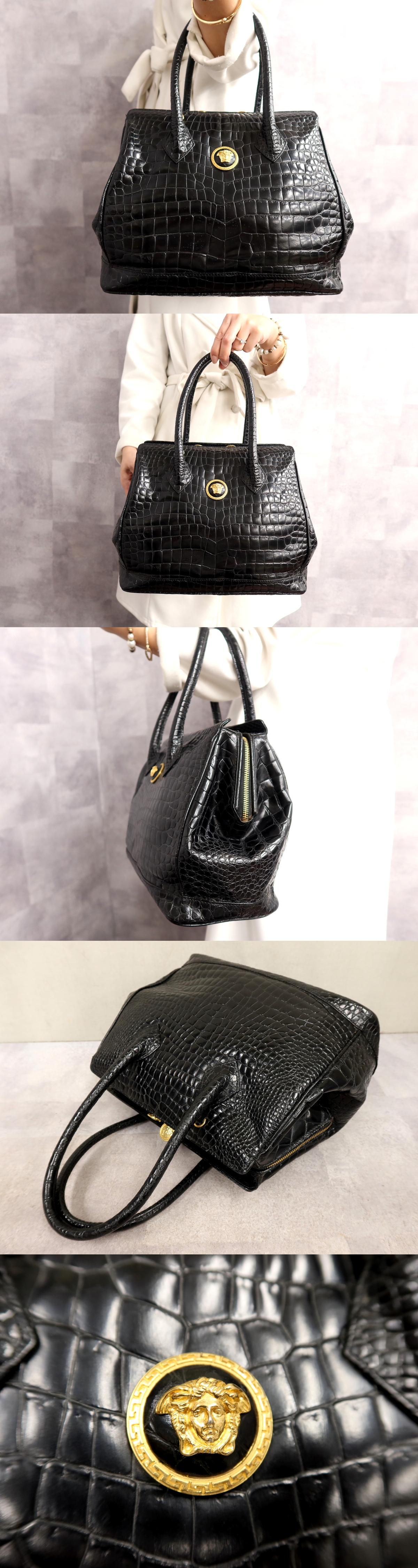 Store ●超美品●ジャンニ・ヴェルサーチ●メデューサ●クロコダイル 型押し レザー 本革●ハンド バッグ●黒●G金具●ヴィンテージ●B5●Js66329
