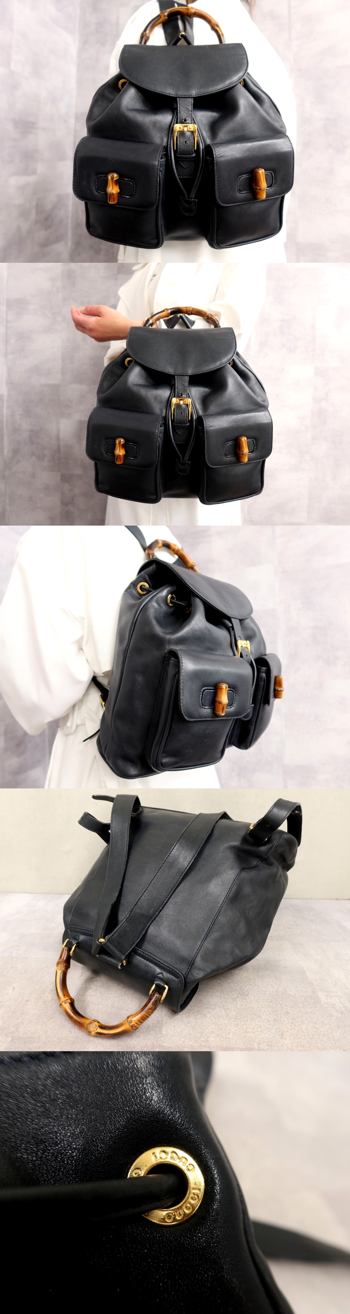 Store ●超美品●GUCCI グッチ●バンブー●カーフ レザー 本革●リュックサック●ネイビー●ゴールド金具●ヴィンテージ●B5 書類 収納●Js66654
