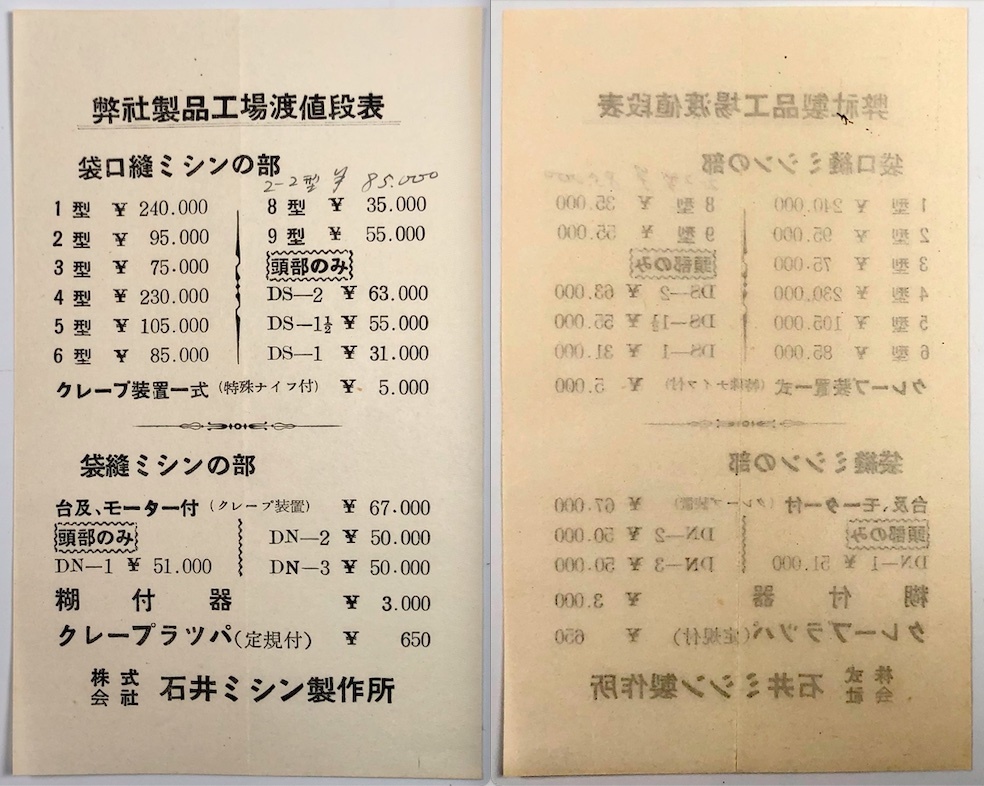 石井式袋口縫ミシン カタログ2種(石井ミシン製作所/価格表・封筒あり/戦後/レトロ/JUNK)