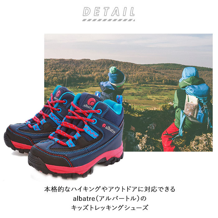 商品説明・本格的なハイキングやアウトドアに対応できる、albatre(アルバートル)のキッズトレッキングシューズ。