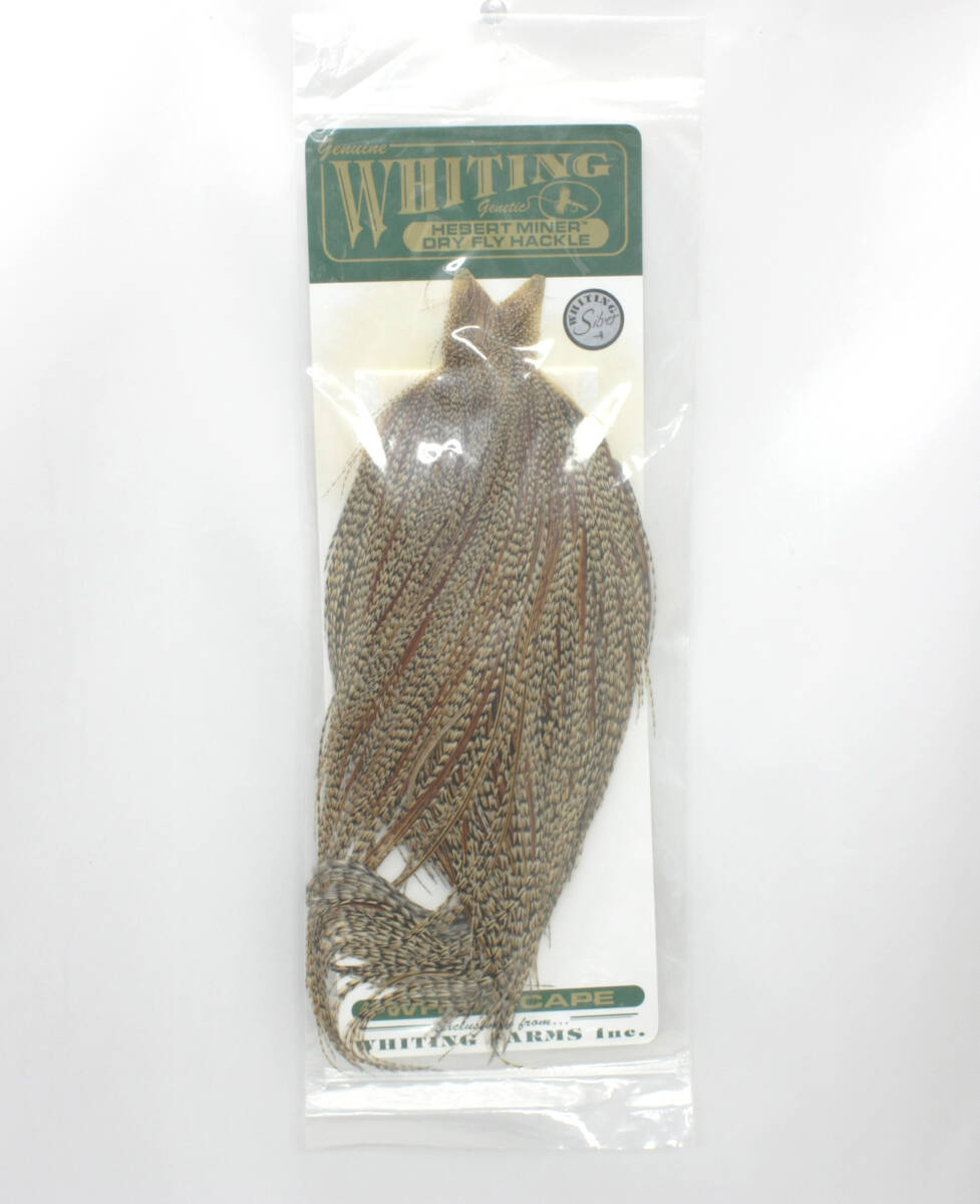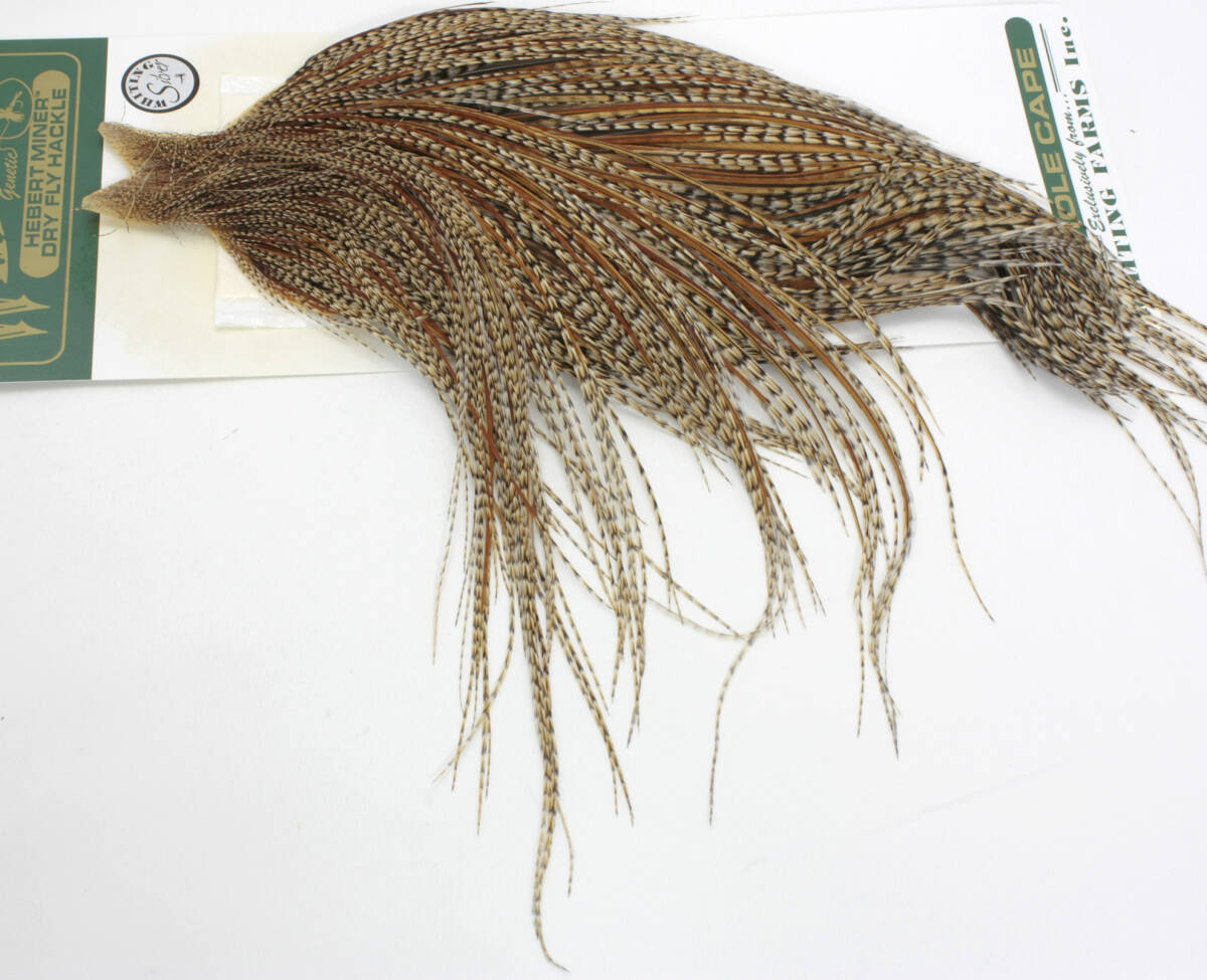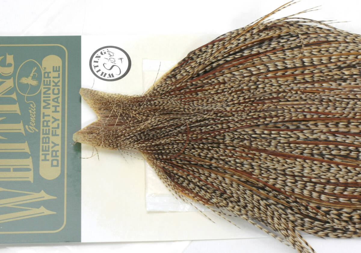 ハックルの最高峰、ホワイティングのケープです。ホワイティングは巻きやすさや発色など非常に優れています。ヒーバートはやや薄めでファジーな感じになり、赤ラベルにはない独特の虫っぽい色合いが特徴的です。