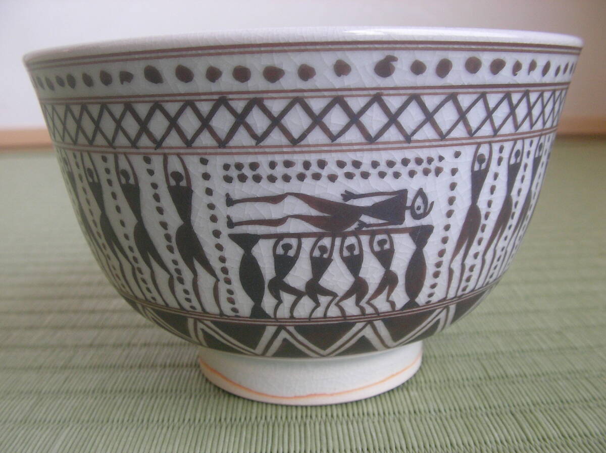 京焼の地に、古代オリエンタルを思わせる人物や家畜?の絵があしらわれています。