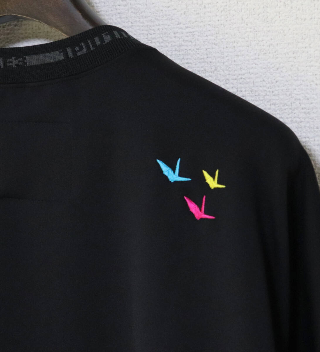 ストレッチが効いたさらりとした生地が特徴的なオーバーシルエットクルーネック。スウェット素材ではないので、オールシーズン着用出来るのも嬉しい。フロントロゴと後ろの左肩に入ったカラフル折り鶴の刺繍もアクセントになっています。