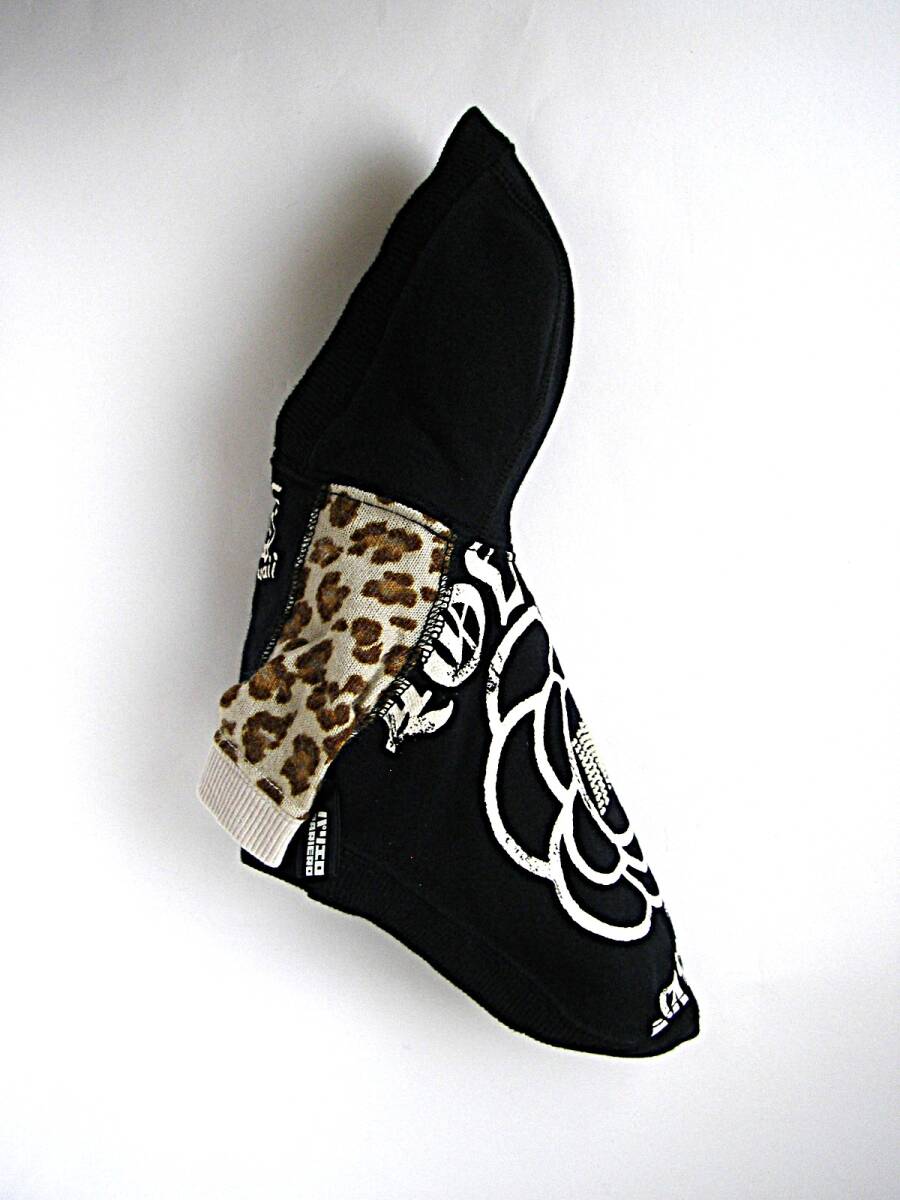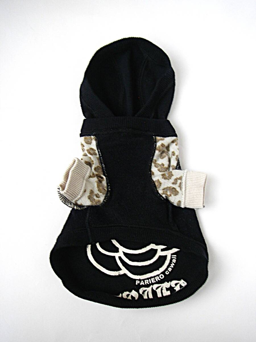 ボディ-とフードが黒、スリーブがアースカラーのアニマル柄です。