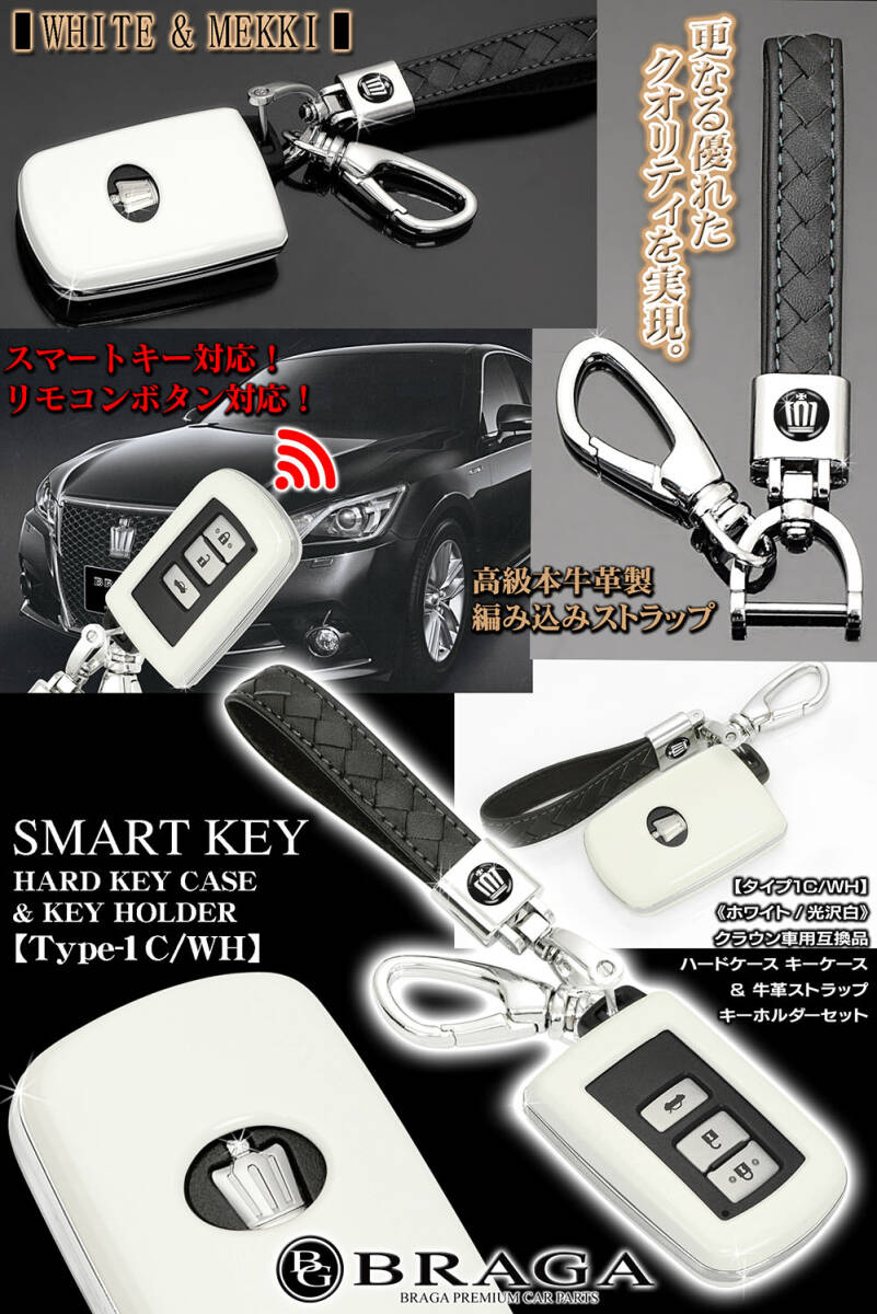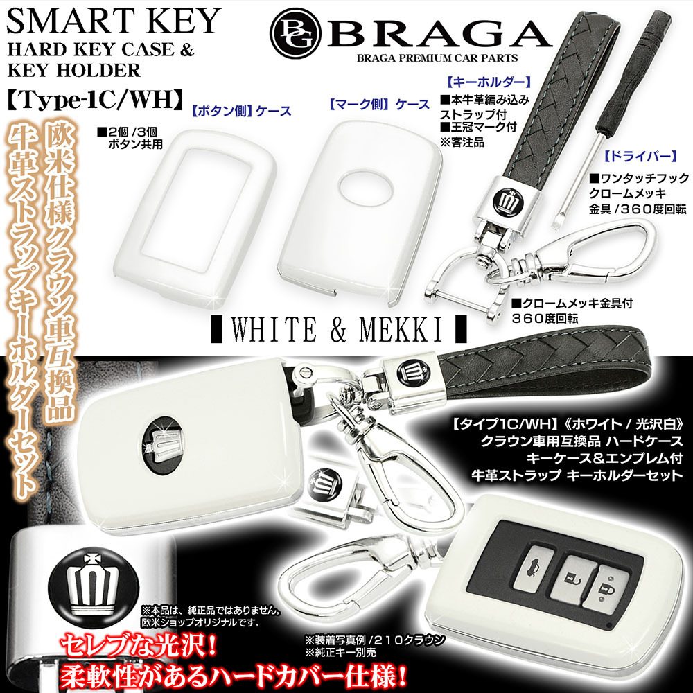 タイプ1C/WH(210系クラウン/210系マジェスタ】《ホワイト/光沢白》スマートキー対応ハードケース キーケース&クラウン王冠エンブレム付牛革ストラップ キーホルダーセット