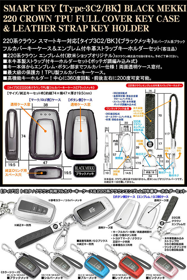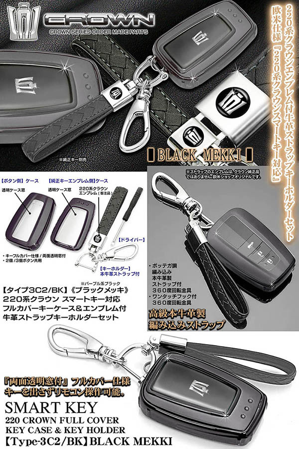 Product name: タイプ3C2/BK/220系クラウン/ブラックメッキ/スマートキー対応/TPU製 フルカバー キーケース/エンブレム付/牛革製キーホルダーセット