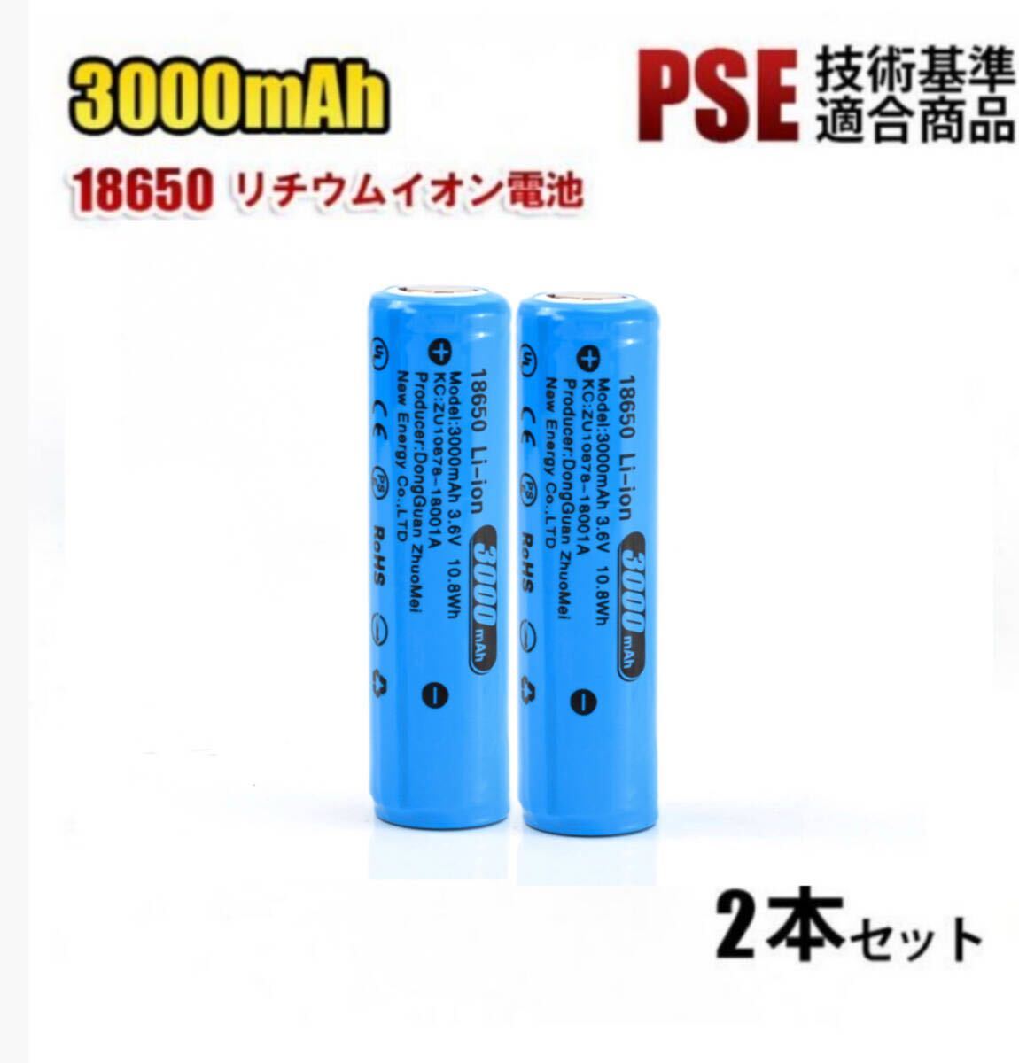 【2本セット】18650 リチウムイオン電池 バッテリー フラットトップ 高容量 3000mAh 3.6V PSE認証 送料無料