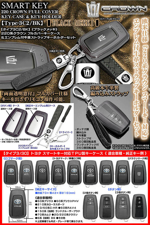 20/220クラウン/タイプ3C2/BK/220系クラウン/ブラックメッキ/スマートキー対応/TPU製 キーケース/エンブレム付/牛革ストラップ