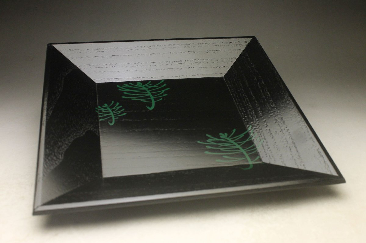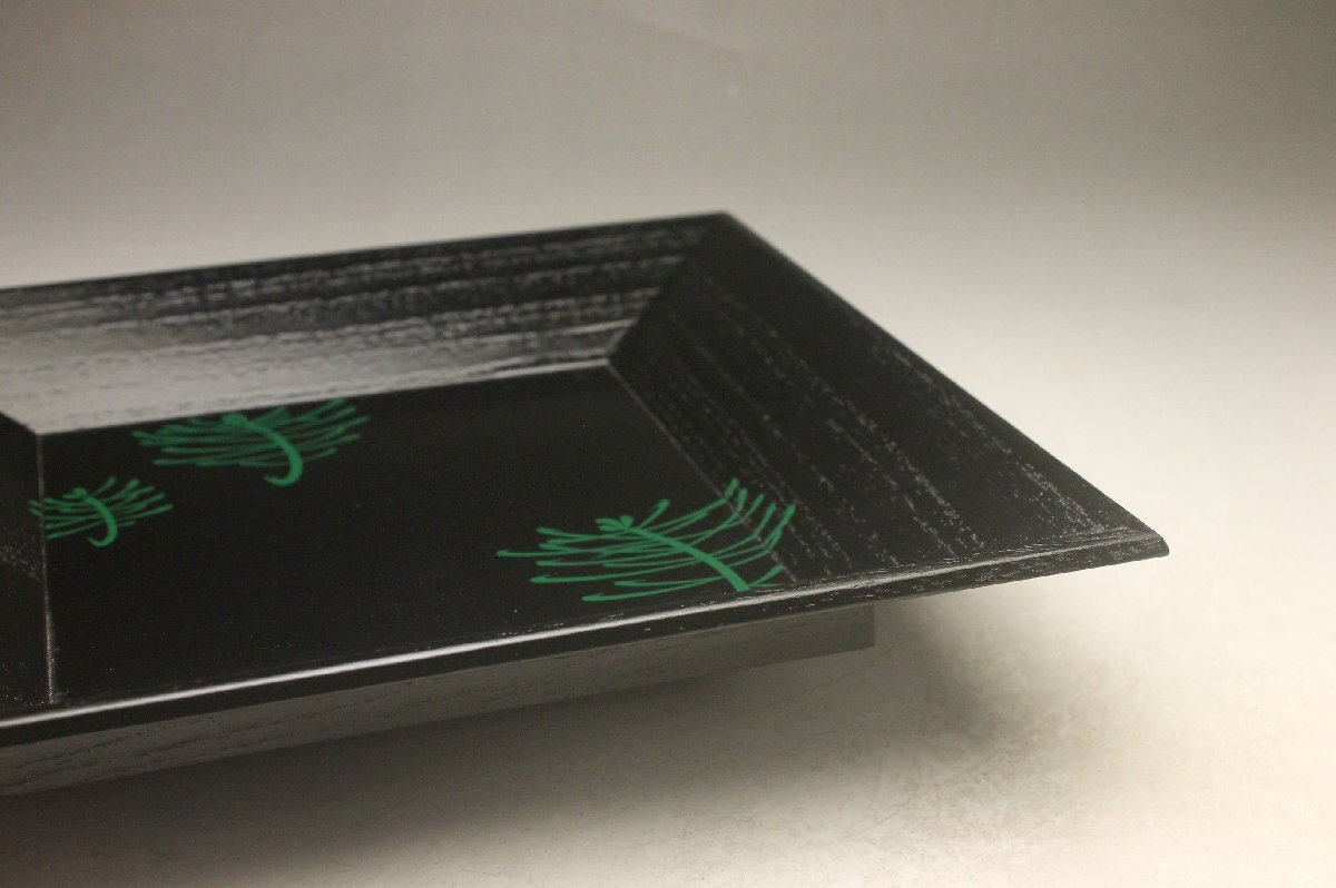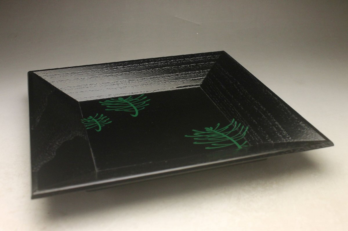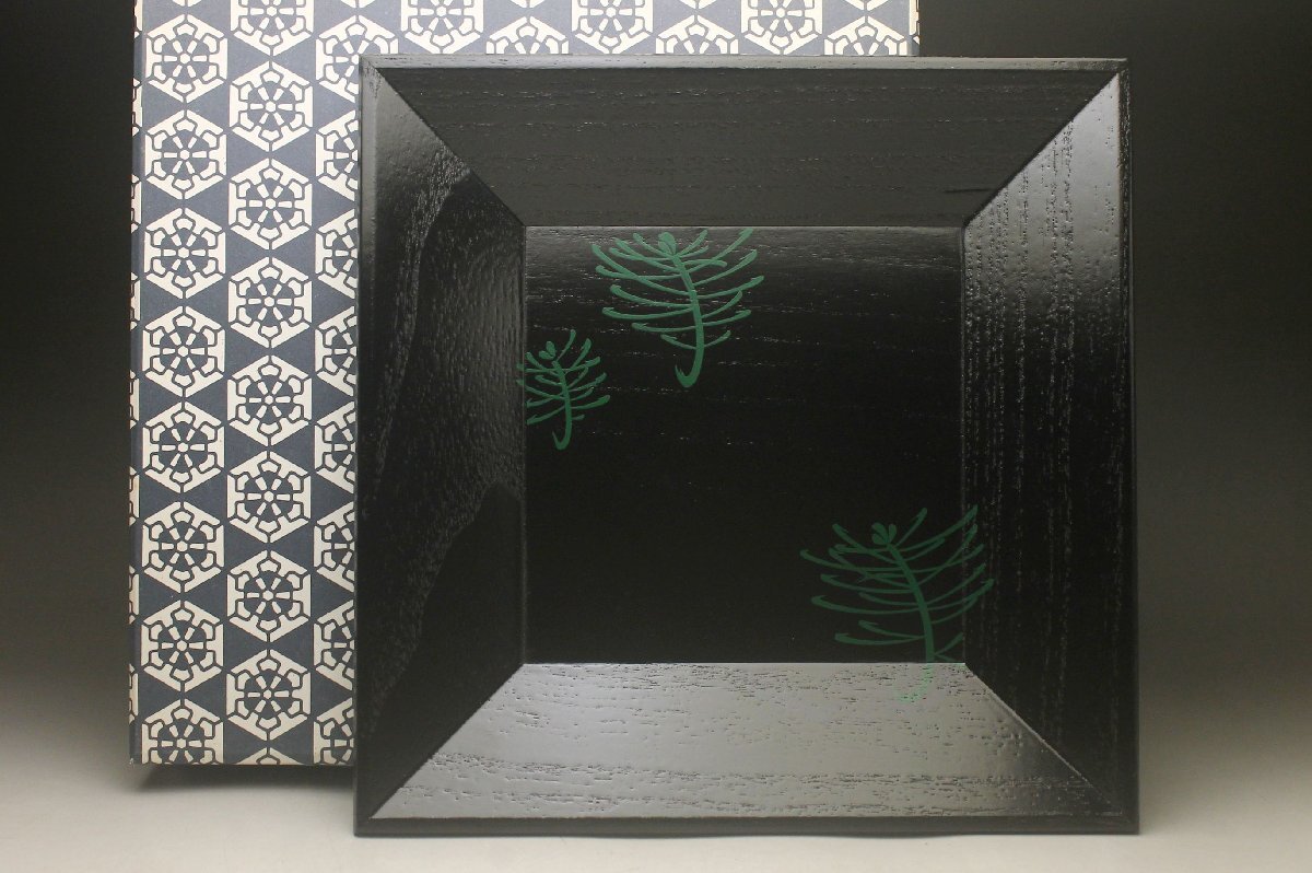 Product name: 【余韻】 天然木製 緑漆松文 四方盆★化粧箱 無傷美品<同梱可>