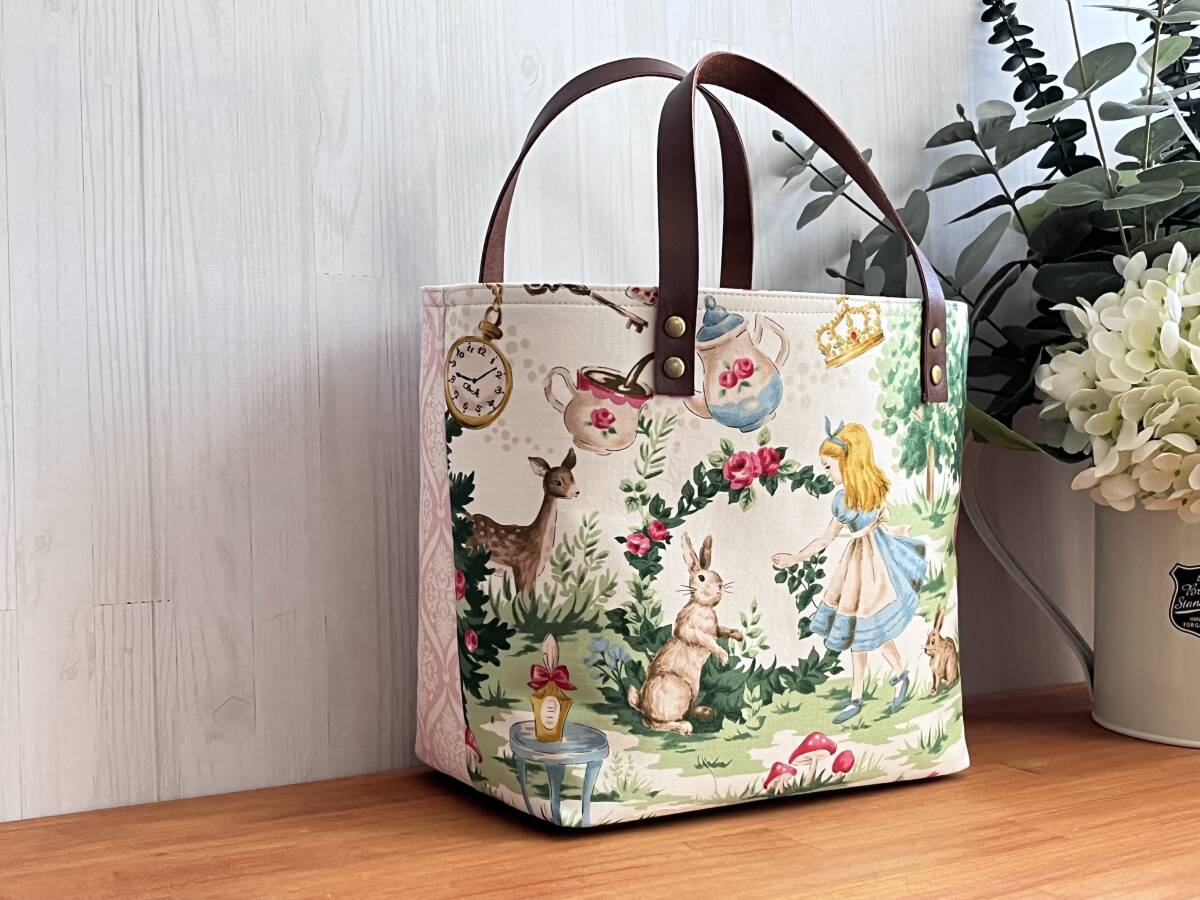Product name: ハンドメイド+迷い込んだ不思議の国のアリス+④+うさぎ+バラ +ティーポット+ピンク+ バラ+ Mサイズ+ころりん+トートバッグ +本革