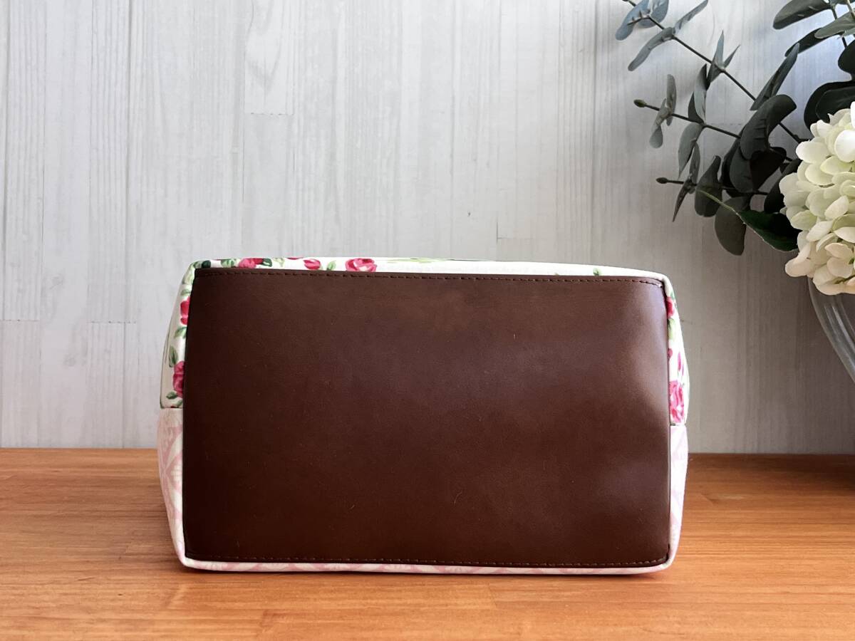 底の部分は、汚れにくい合皮を持ち手には本革(茶)を使用しています。