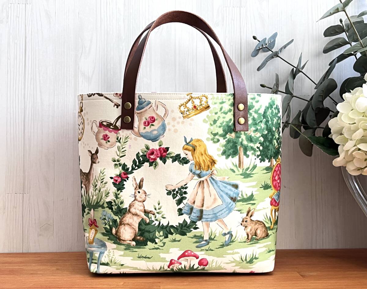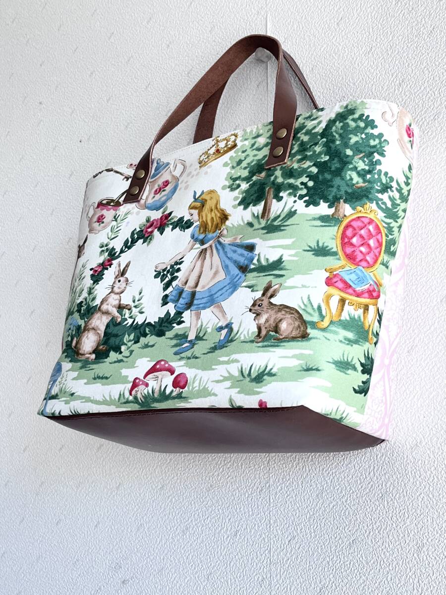 ハンドメイド+迷い込んだ不思議の国のアリス+④+うさぎ+バラ +ティーポット+ピンク+ バラ+ Mサイズ+ころりん+トートバッグ +本革