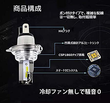 Product name: H4 LED バルブ ヘッドライト フォグランプ ホワイト 白 2個セット 爆光 80W 1860 全面発光 LEDヘッドライト 1860 CSPチップ搭載 無極性