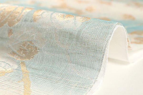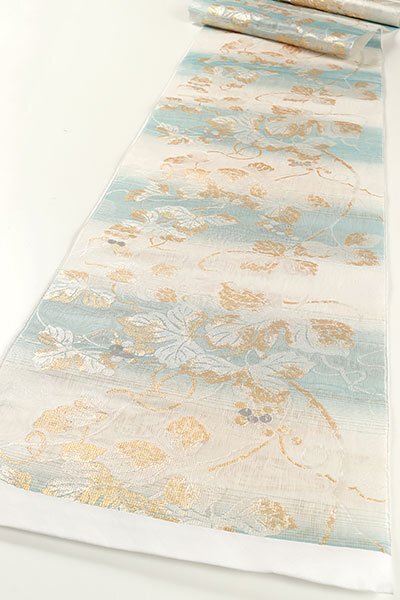 少し透け感のある帯地は錆青磁色と白色のお色目で横段状にぼかすように織り上げられております。