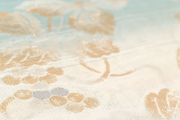 全体には金銀糸や鳩羽鼠色のお色目で、葡萄唐草が織り上げられております。