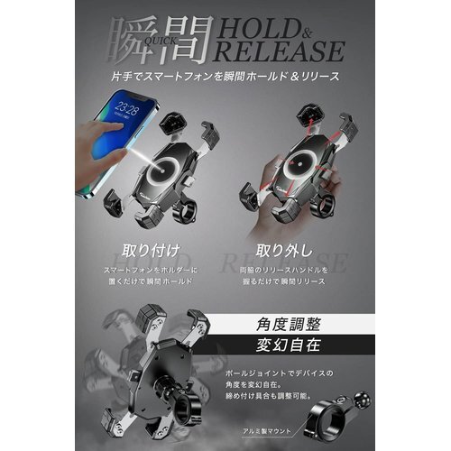 【クイックホールド手裏剣】地球上で最も早く片手でスマートフォンの付け外しが可能なスマホホルダー。スマホを押し付けるだけで瞬時にホールドし、両脇のリリースレバーを握るだけで開放します。初代クイックホールドの弱点を改良し、美しい流線形状へと進化した後継モデル「クイックホールド手裏剣」クイックホールドの命の源であるスプリングを日本精線株式会社製のスプリングを組み込み、長期間安定したバネレートが更なる操作性を生み出す。「ホルダーにスマホを取り付けるのが面倒」、「縦長、分厚い、カメラが出っ張る機種でも4点式のクイックホールドが使いたい」、そんな方にオススメなモデルKDR-M22Cです。※ご注意:本製品KDR-M22Cには充電機能はございません。充電タイプはクイックホールド手裏剣QIUSB/KDR-M22APです。