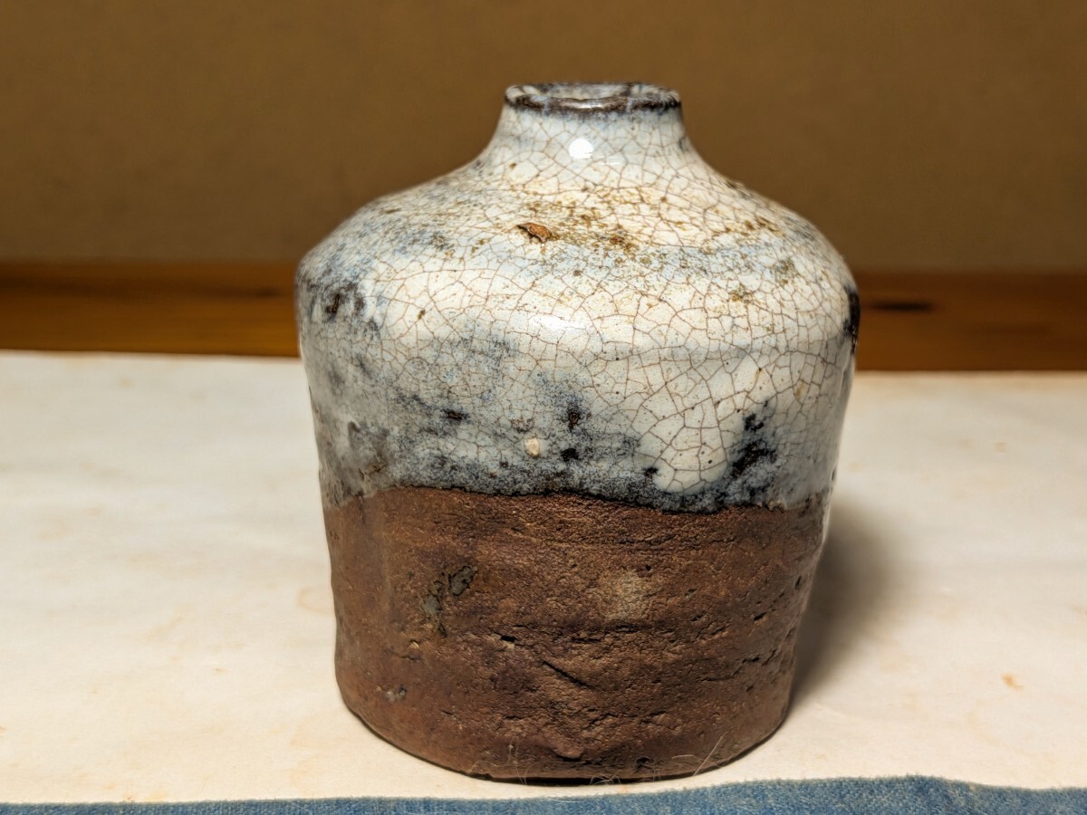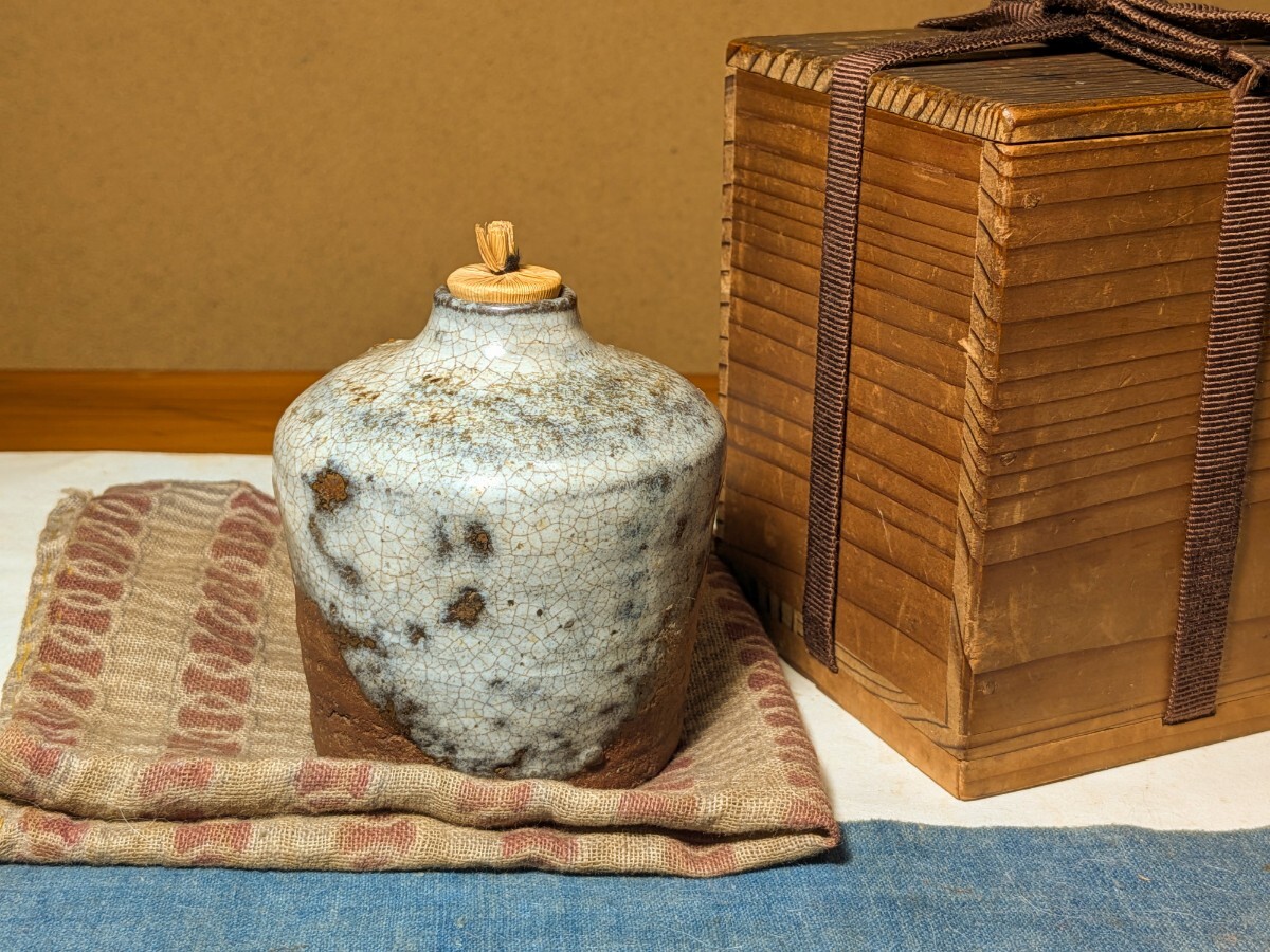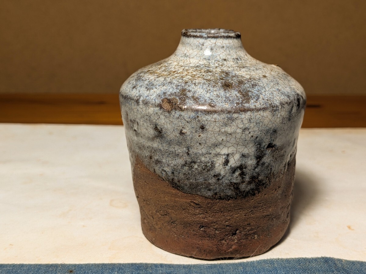 斑唐津の振出しです。しっとりとした肌の伝世品です。口辺が外反しない変わった形です。肩の張った形と全体的に青味がかる斑釉から古高取内ケ磯窯の産の可能性がありますが同時代の同技法の総称として斑唐津としました。無傷と言って良い状態です。8勺入るので手酌徳利としても楽しめます。深い釉調を御堪能いただける大振り斑唐津振出しを特別出品です。箱あり。・胴径7.4センチ・高さ8センチ・容量8勺・桃山時代 ※新規の方、評価の悪い方の入札は取り消す場合があります。商品到着後は速やかに取引ナビの受取連絡を入れて下さい。