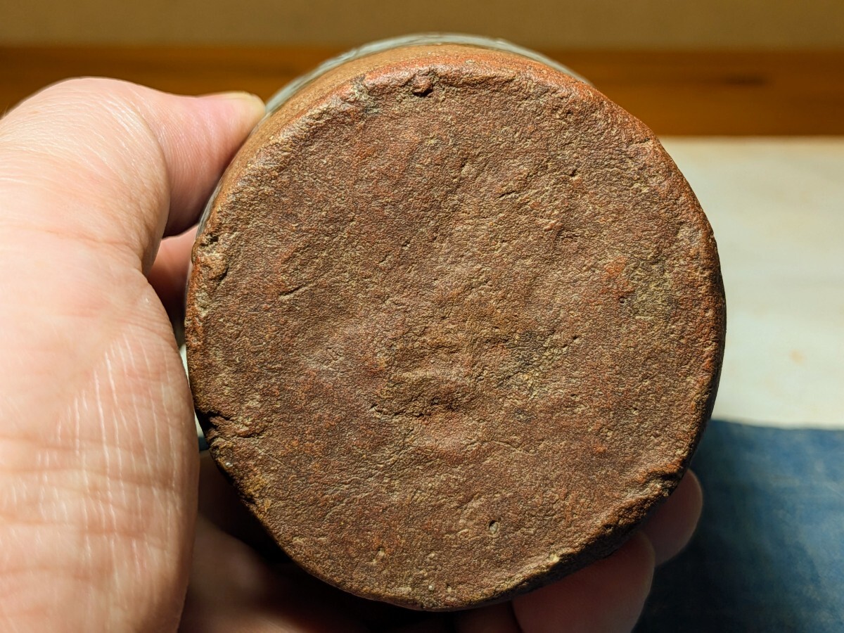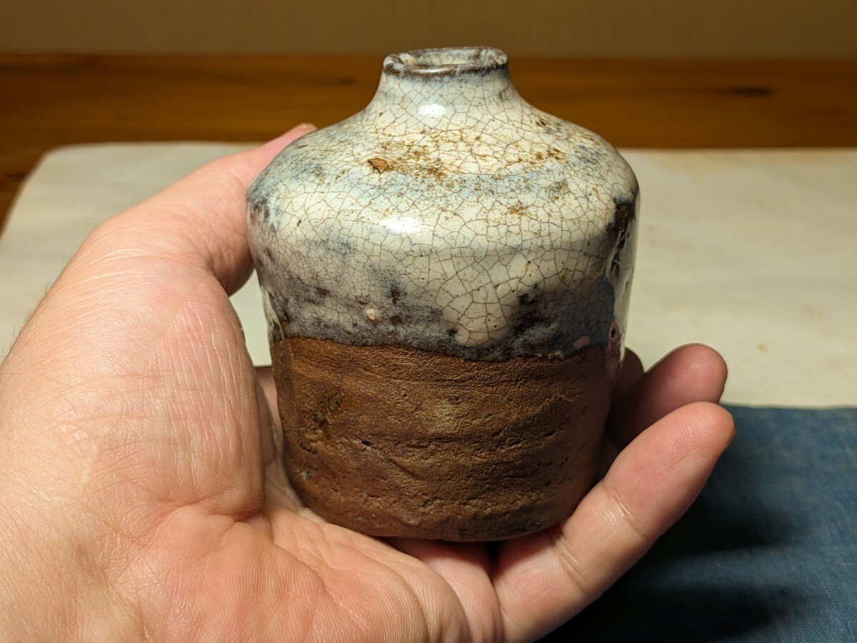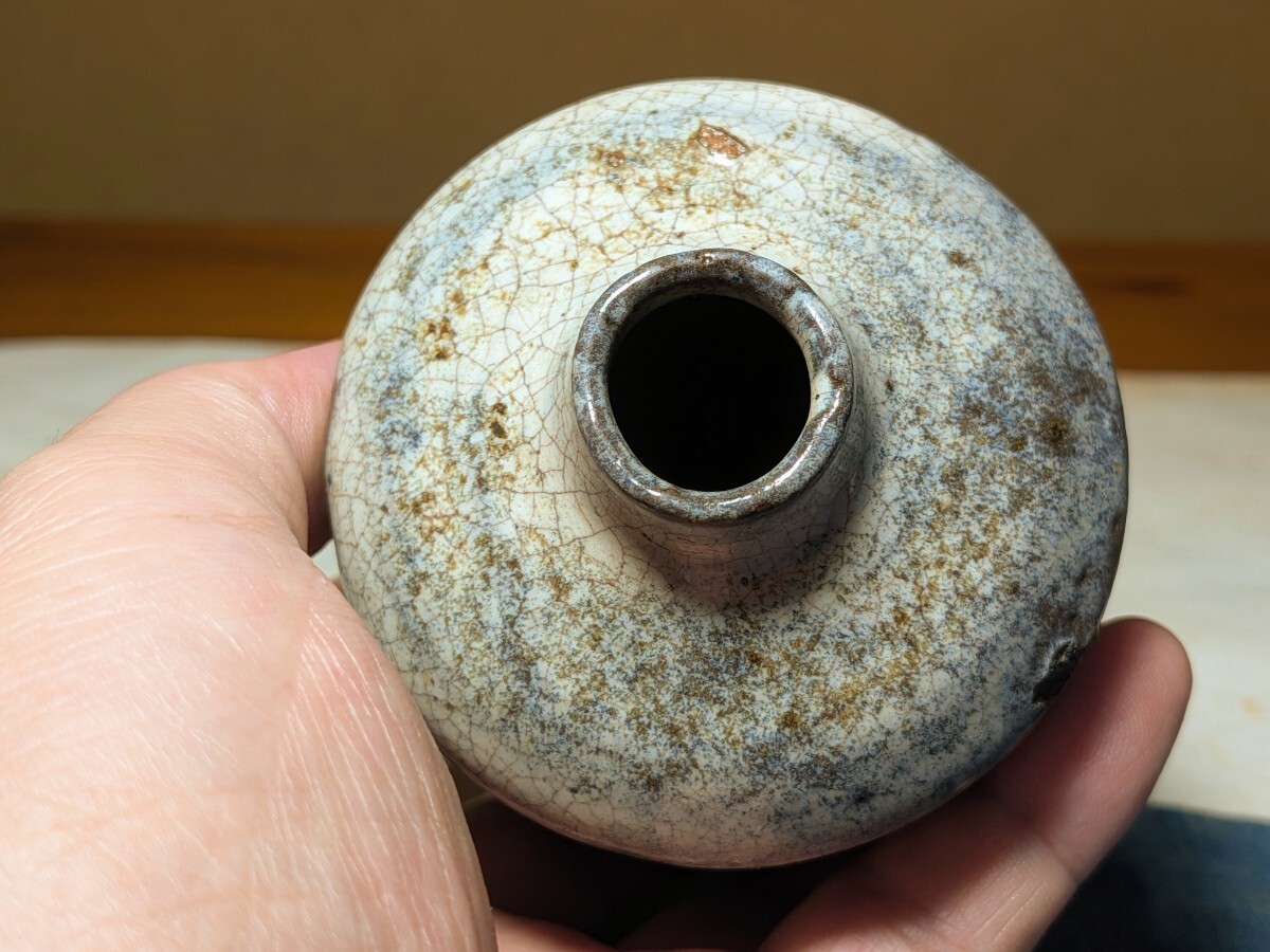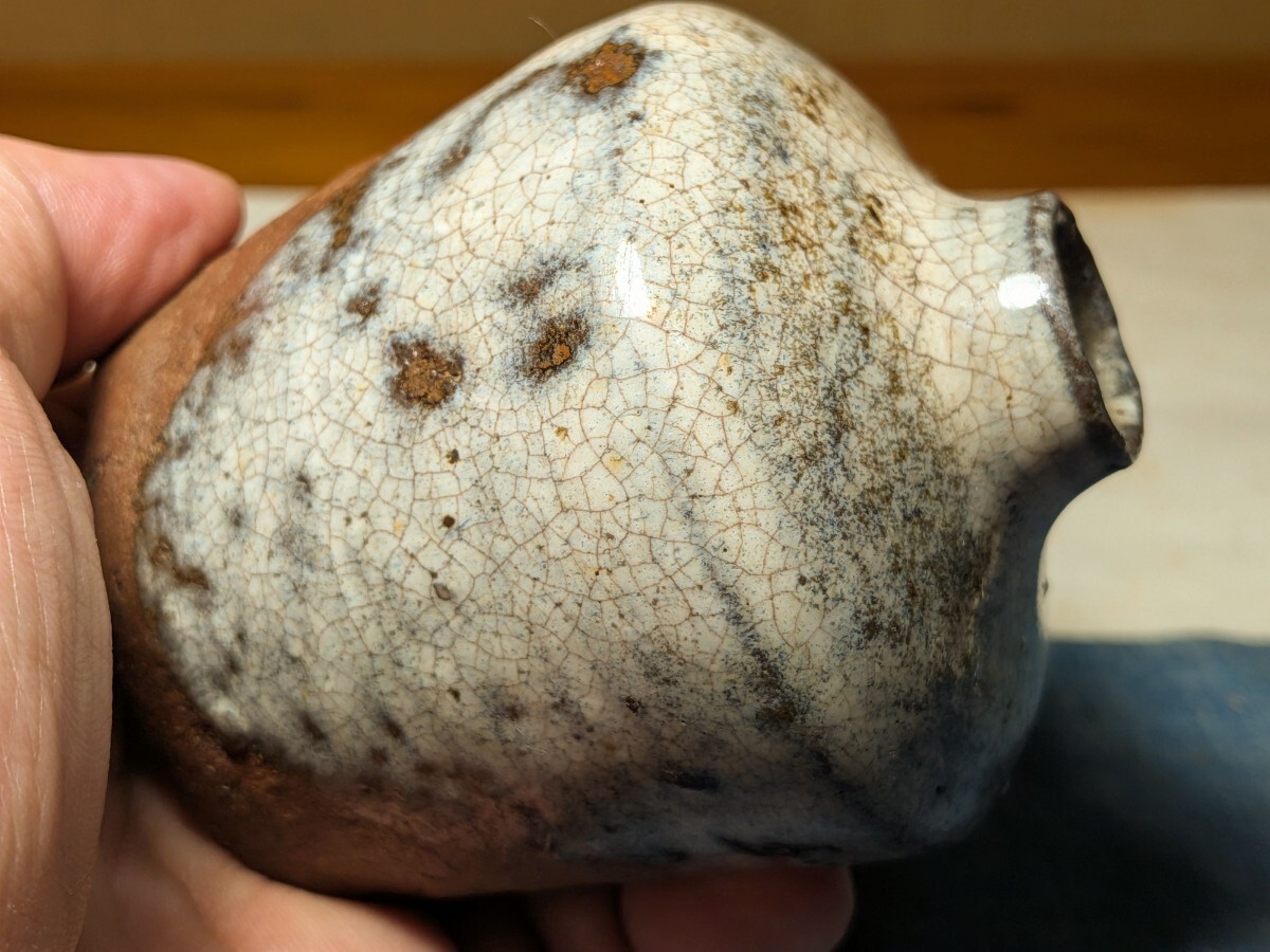 斑唐津の振出しです。しっとりとした肌の伝世品です。口辺が外反しない変わった形です。肩の張った形と全体的に青味がかる斑釉から古高取内ケ磯窯の産の可能性がありますが同時代の同技法の総称として斑唐津としました。無傷と言って良い状態です。8勺入るので手酌徳利としても楽しめます。深い釉調を御堪能いただける大振り斑唐津振出しを特別出品です。箱あり。・胴径7.4センチ・高さ8センチ・容量8勺・桃山時代 ※新規の方、評価の悪い方の入札は取り消す場合があります。商品到着後は速やかに取引ナビの受取連絡を入れて下さい。