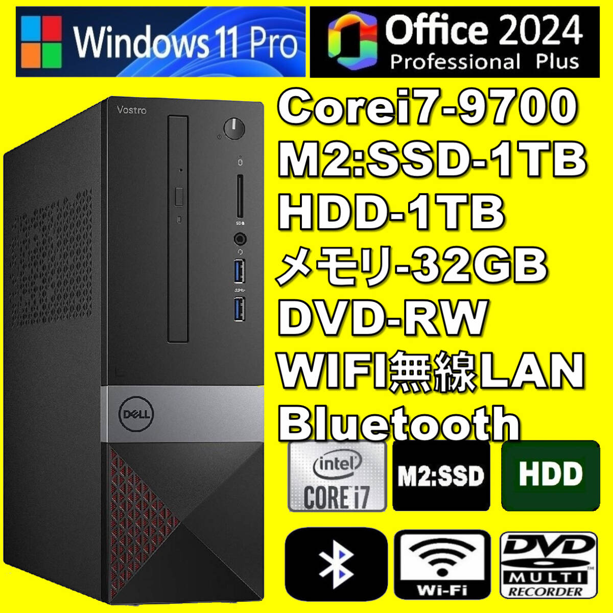 爆速!/ Corei7-9700/ M2:SSD-1TB/ HDD-1TB/ メモリ-32GB/ DVD-RW/ WIFI/ Bluetooth/ Office2024Pro/ Win11Pro/ メディア15
