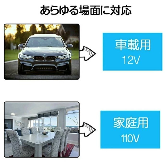 車載DC12V、家庭用AC100V電源対応、家庭用ACアダプターとDCシガープラグケーブルが同梱します。定格消費電力55W。
