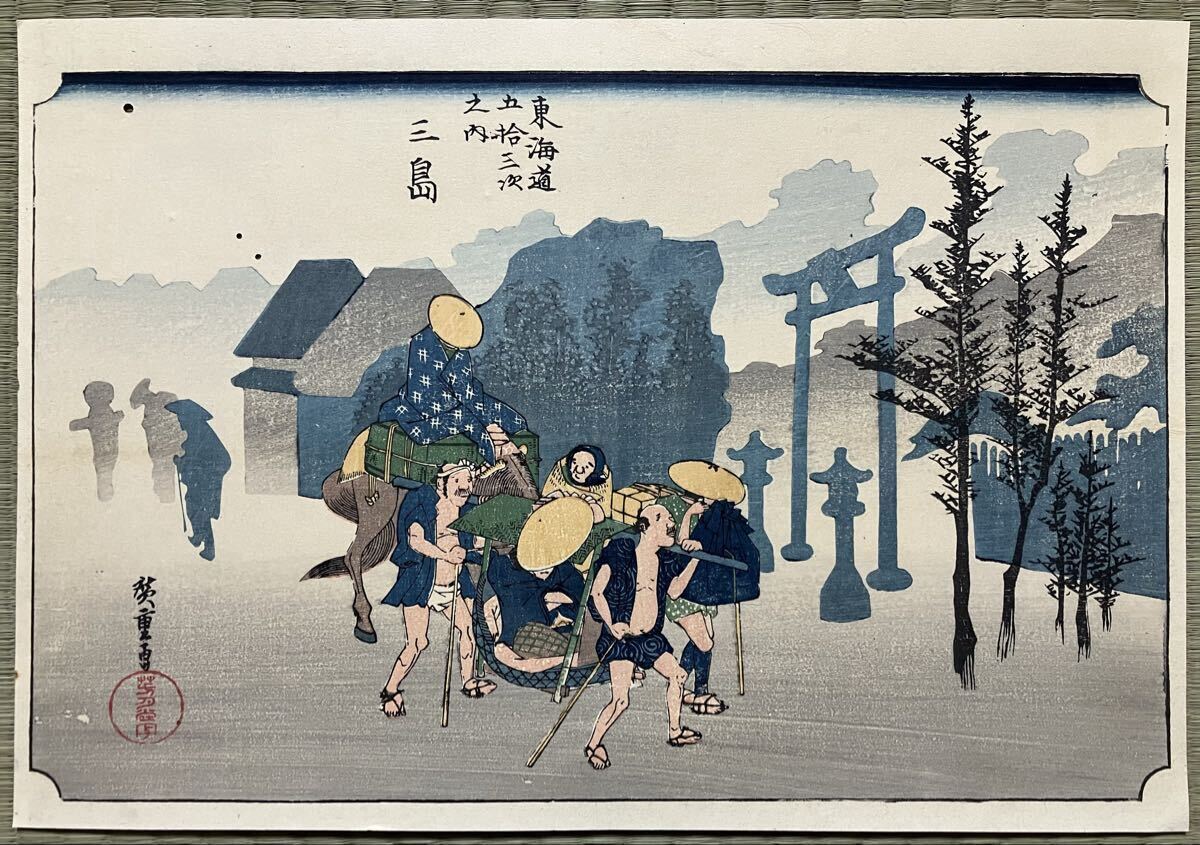 【真作】江戸期 本物浮世絵木版画 歌川広重 東海道五十三次 三島 名所絵 大判 錦絵 裏打ち 保存良い 検:北斎 歌麿 写楽 国芳 芳年