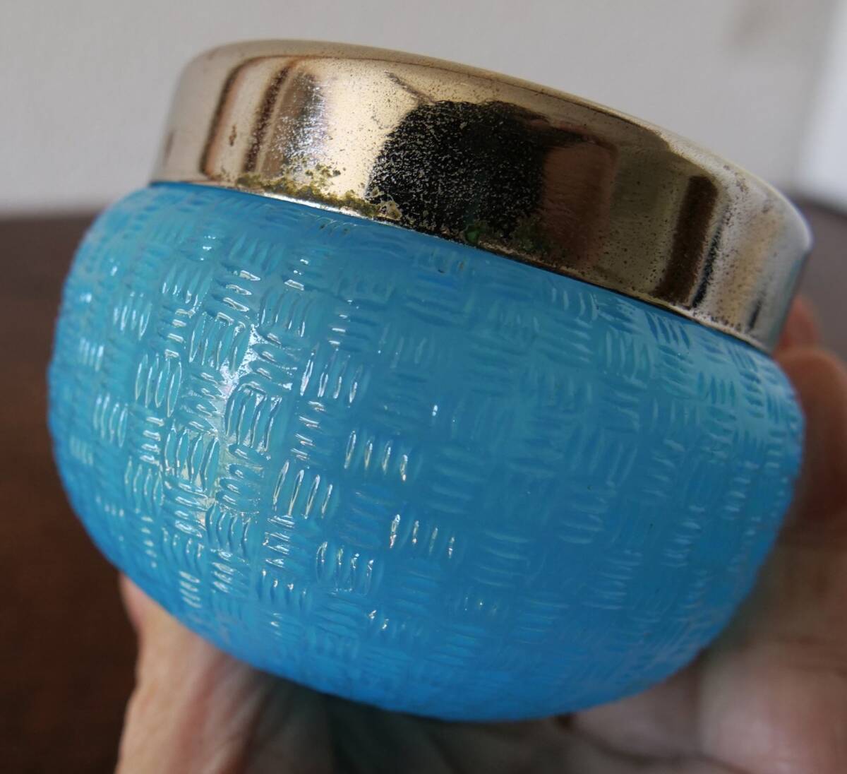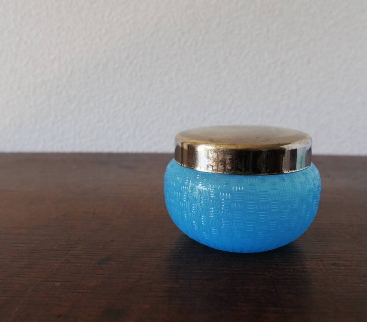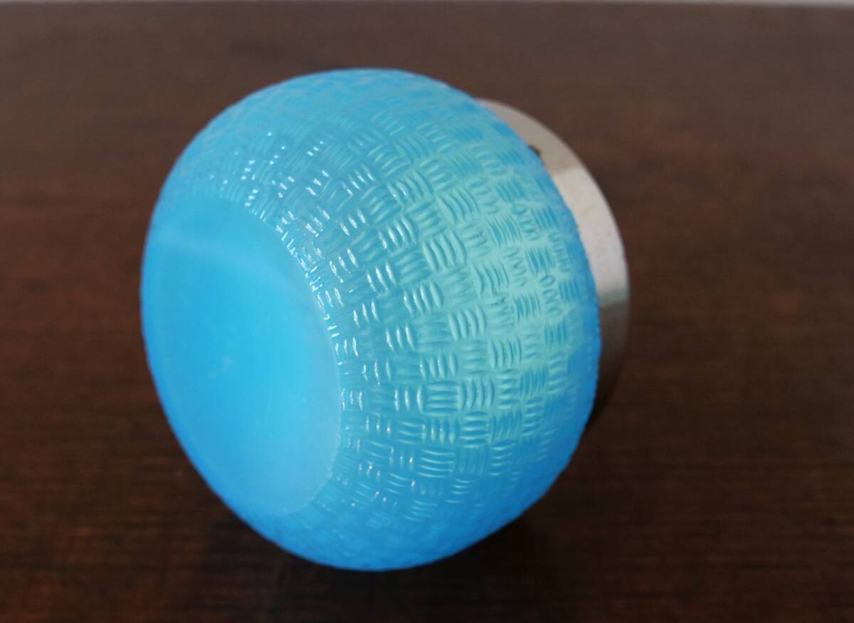 戦前の青色練りガラス、上品な籠目文のあめや瓶です。