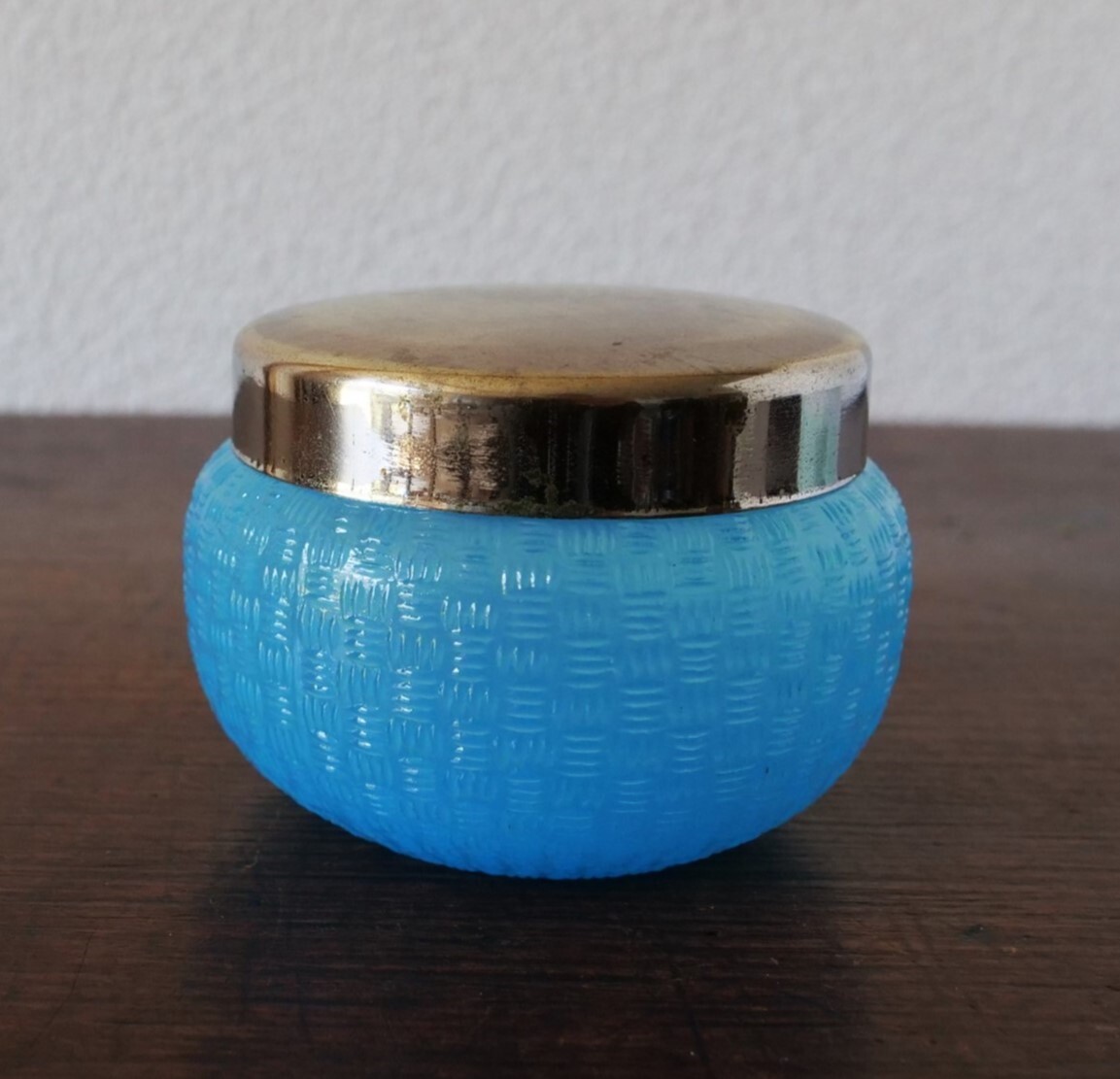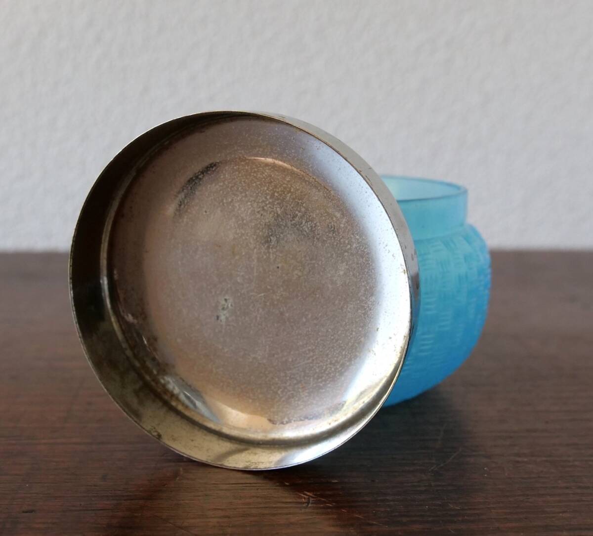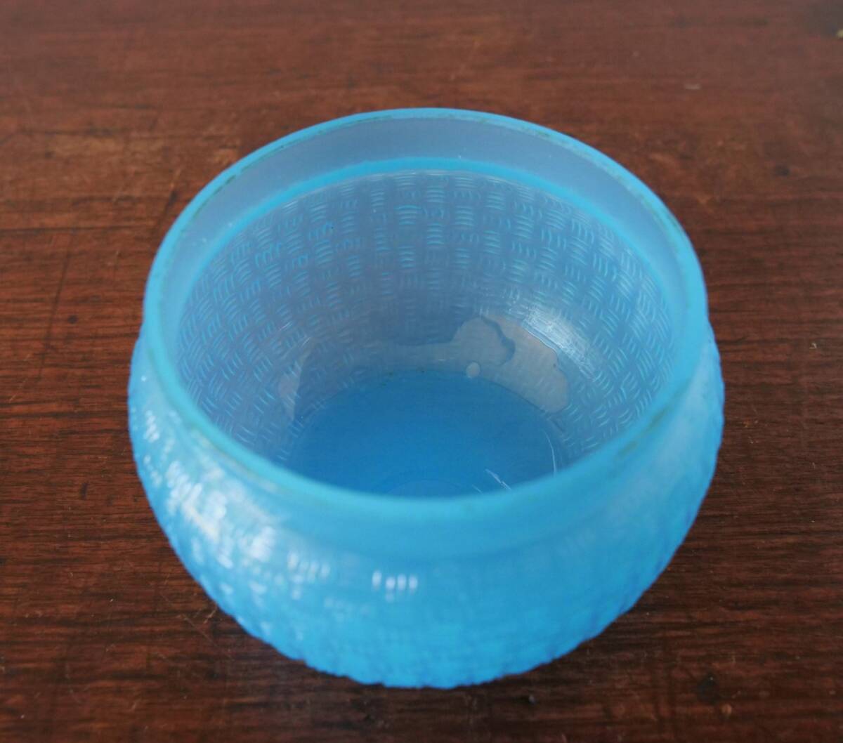 戦前の青色練りガラス、上品な籠目文のあめや瓶です。